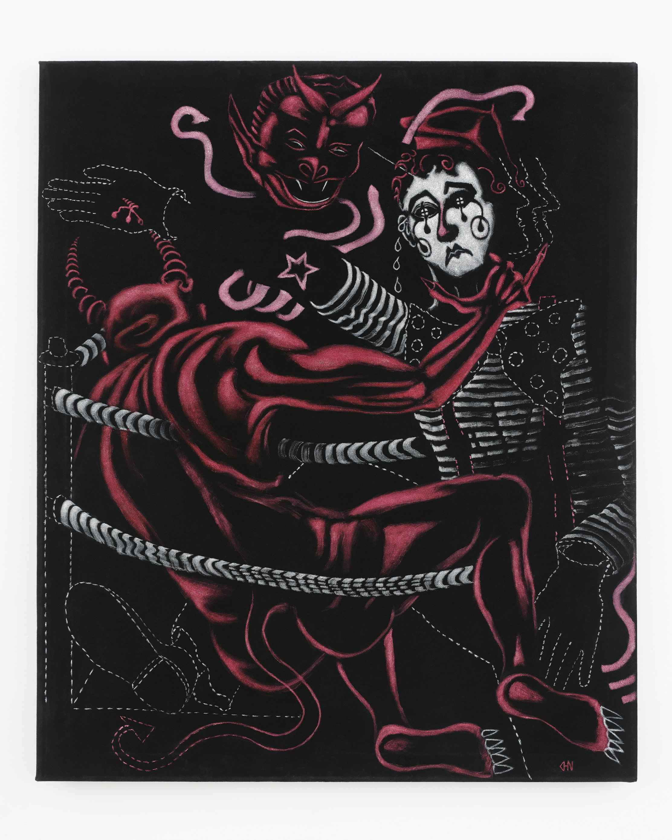 we all have our Demons, some are of our own making, for the artist they manifest in many forms. the Mime (the silent drives of the subconscious) uses the power of illusion to thwart its opponent, the Demon attempts to control the mind, even appearing as two. the canvas is the wrestling ring where the duality of real/ not real, dark and light materialize. the Nobody becomes the Fantastic, in a painterly form within reality itself as a painting. physical signed black velvet painting 36"x30" inches included with this token. Wrestling My Demons, completed December 30, 2025 by David Henry Nobody Jr in Brooklyn, NY.