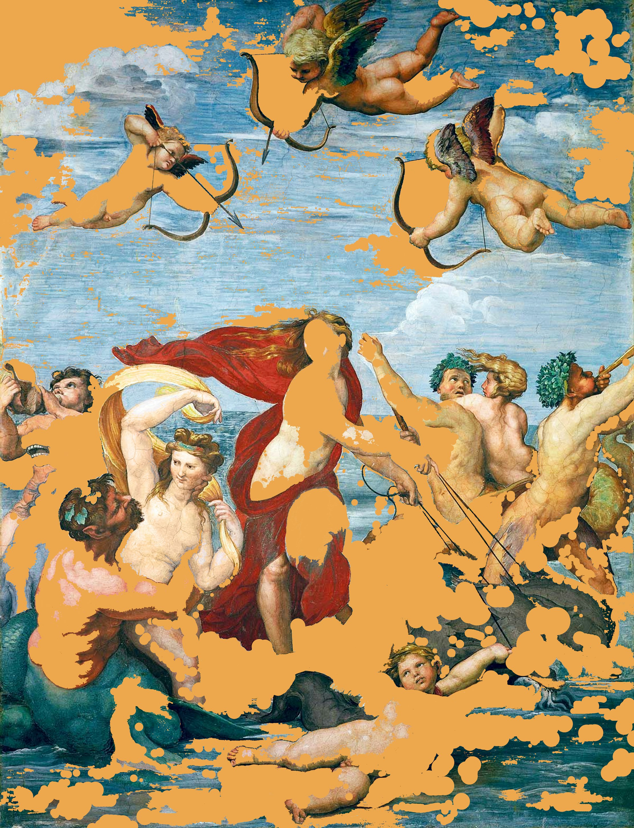 This is the sixth release (#6) from the Screen Memories collection. The series was started in 2017 and 'Galatea' was completed in 2021. Using an iPhone and a Macbook in combination, the series masks imagery in Renaissance paintings with screen-lit 21st-century shapes. W: 3400 px H: 4440 px. Size: 10,120,394 bytes. Format: JPG. Tools: Union, Photoshop. Collection: Screen Memories.
