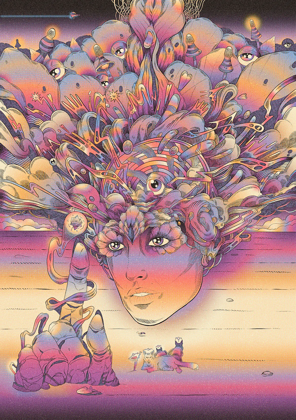 A binaural dive on acid. Eternal journey to the core of your soul. Invisible essence flows through vitral veins as sleepy comets take aim at the pineal. The touch of the goddess and the awakening of the third eye. The protection of cats that read your thoughts and reveal infinite horoscope signs. How far is time and how deep is now? The colors of the wind under the rarefied sea. This art has my signature. Dimension: 4948 x7000 pixels. Resolution: 600 pixels/inch.
