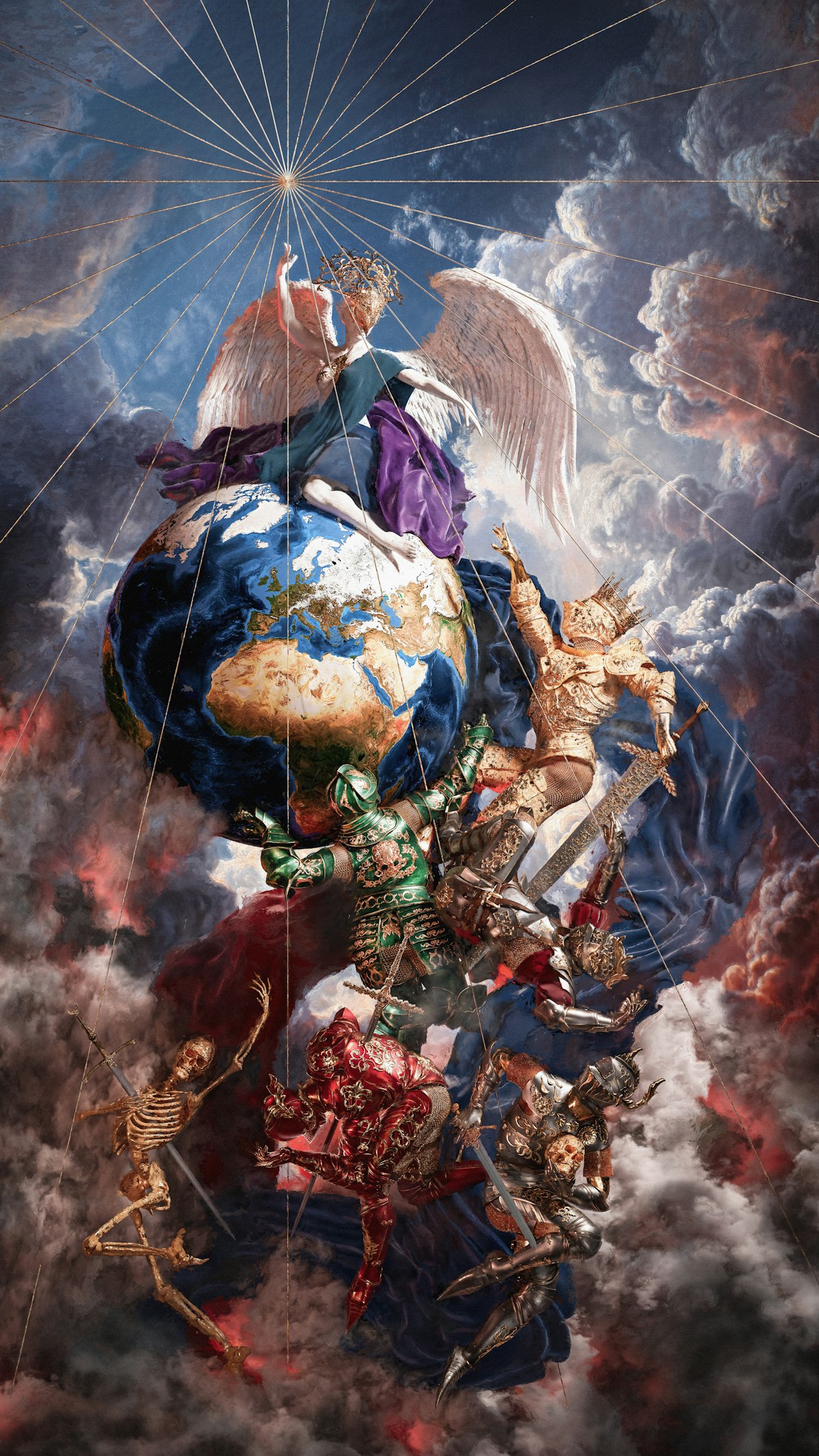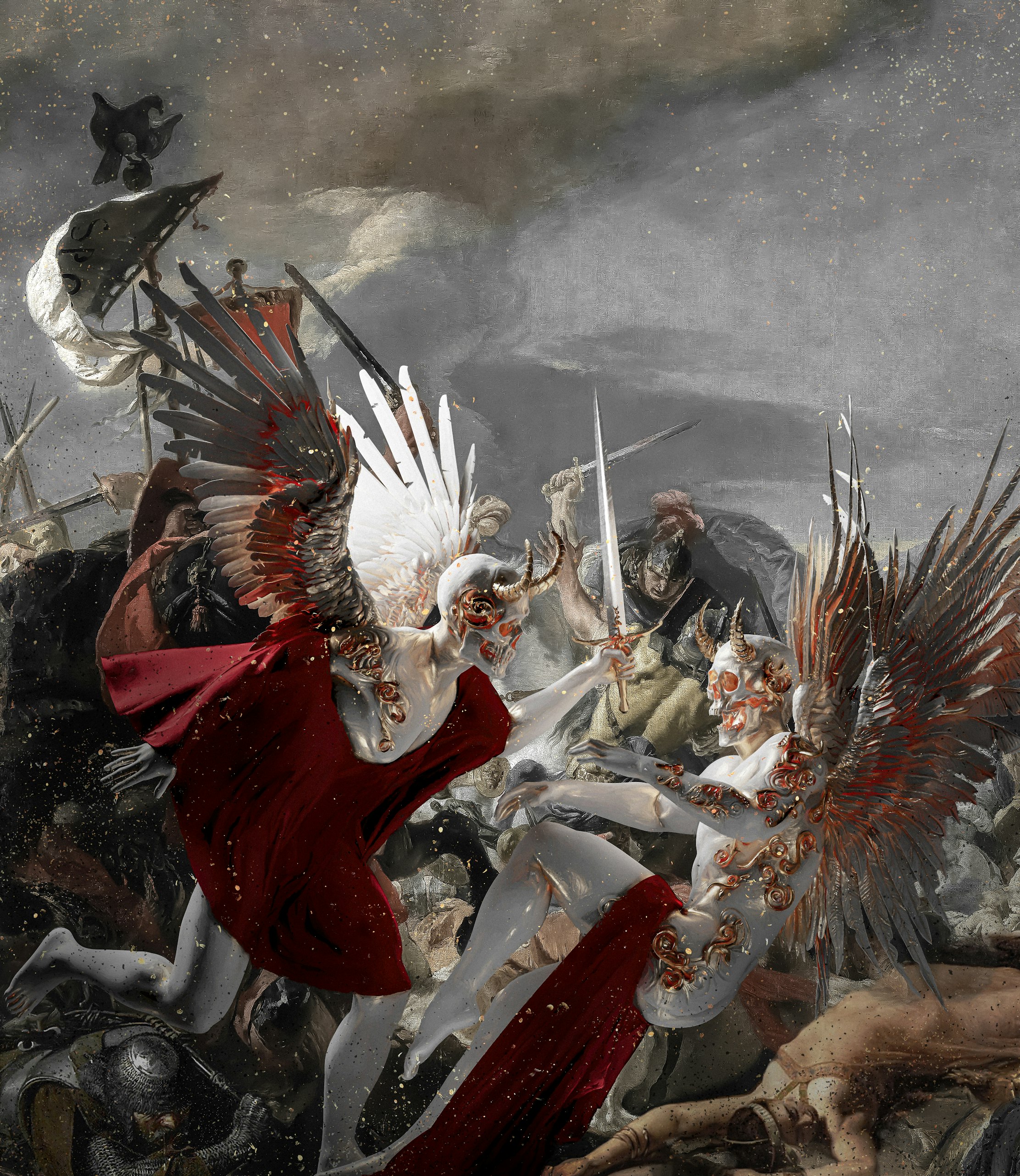 "Clade Fateri" (latin for "admitting defeat") depicts two figures clashing on a heated battlefield. In a single frame, the painting captures the chaotic moment of utter defeat, rendering vivid the misery of impending death. It is the original album cover for the single "Defeatist" by the Zurich-based metalcore band "Polar Shift".