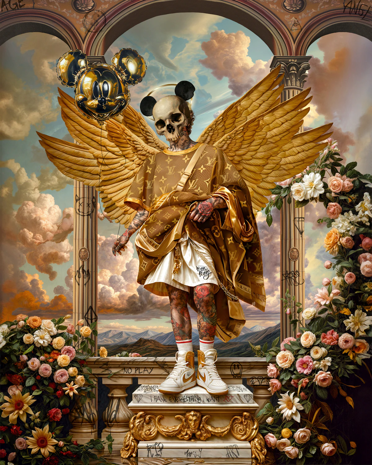 Between heaven and earth, an angel tells eternal stories while holding the serpent of knowledge, the skull of death leaning tenderly toward the mystery of time. The sand in the hourglass falls like silent prayers over a valley that breathes between life and sleep. Wings sprout from its back, but also roots; from its heavenly face springs a tree that unites the mind with the earth. At this threshold where the divine becomes mortal, and the mortal becomes infinite, everything seems to stand still, as if the universe were exhaling a moment of reverence before its own reflection.