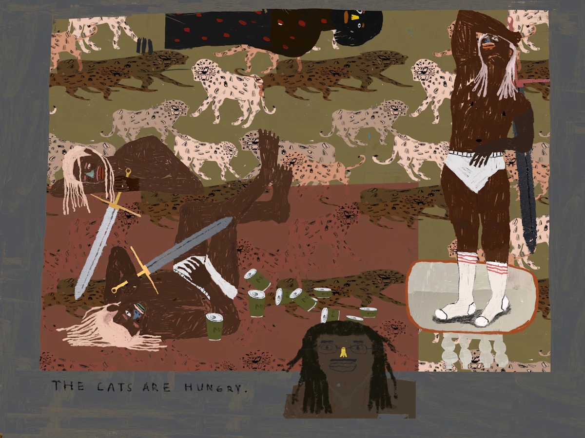 --- acrylics, oil pastels, assorted fabrics and glue on duck cotton canvas.