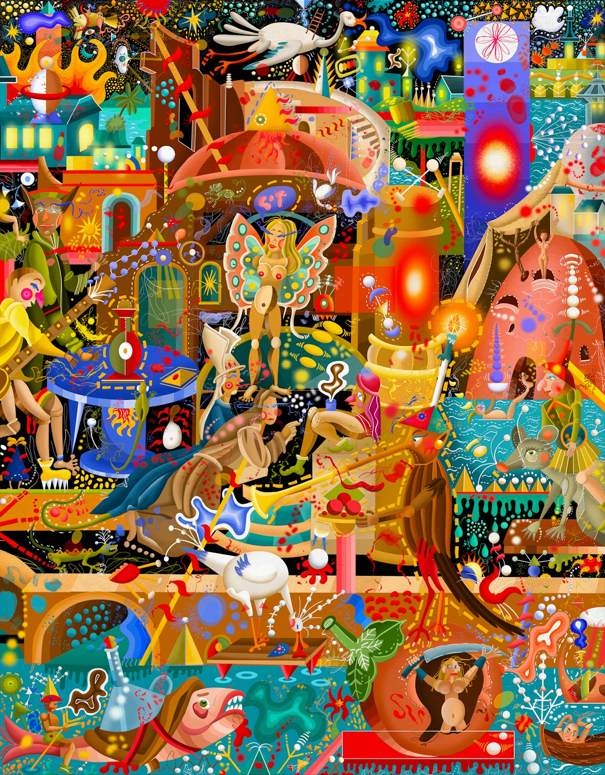 The result is a dense, symbolic ecosystem where past and present collapse and recombine.
