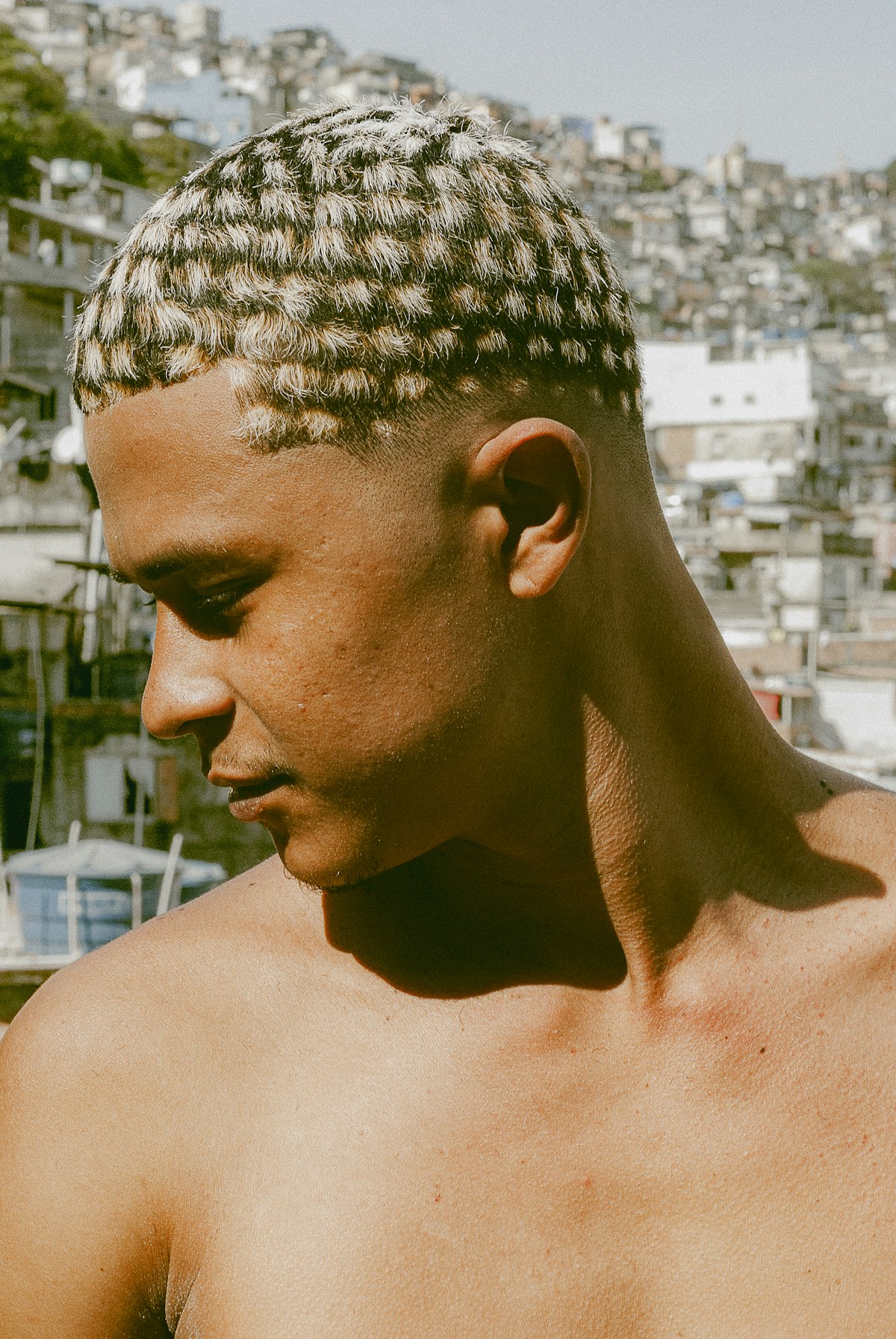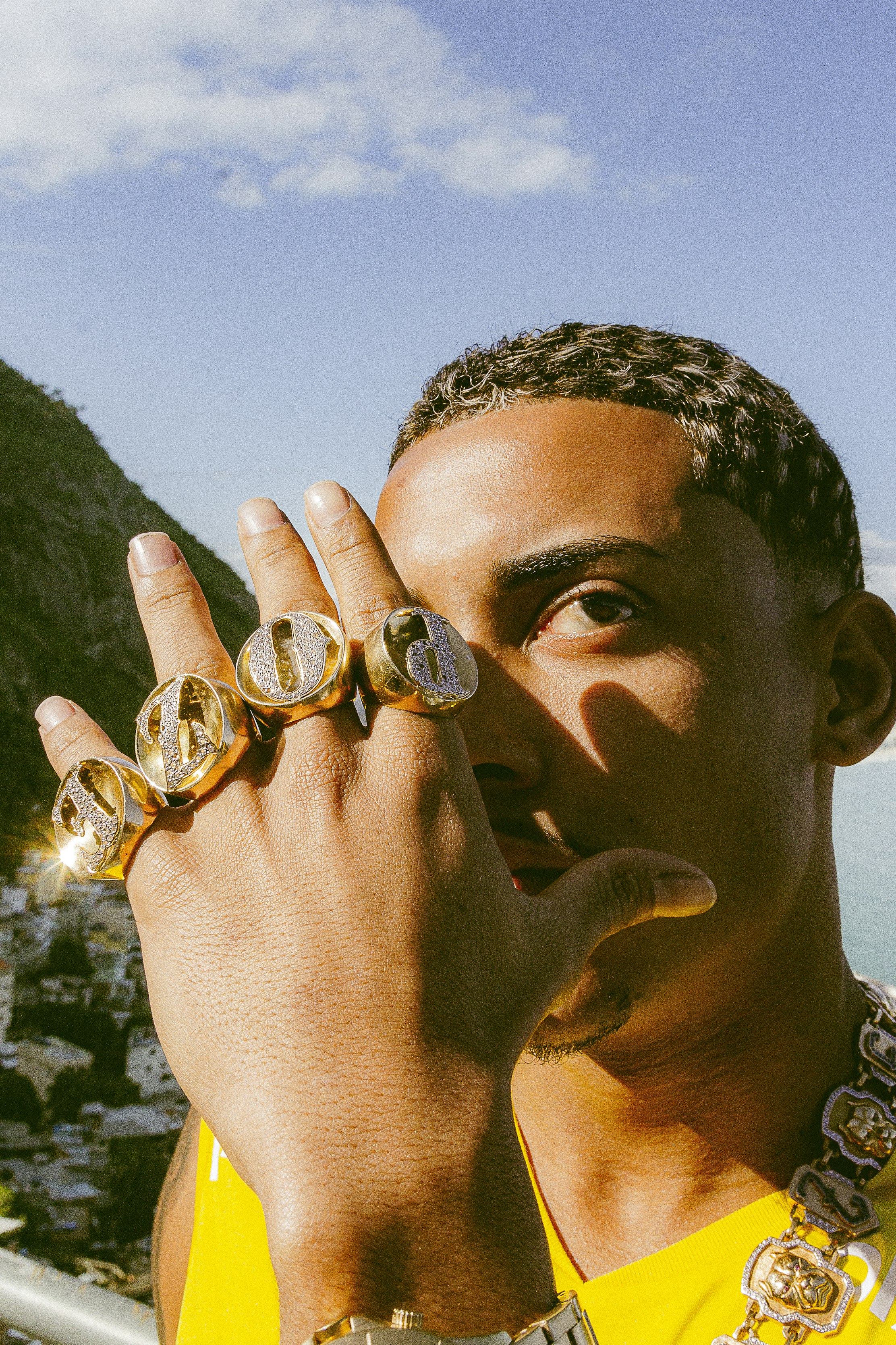 At the top of Vidigal, Poze do Rodo appears with his hand covered in solid gold rings, partially hiding his face. The highlights in his hair shine like a crown, complementing his collection of jewelry and symbolizing wealth earned through music — yet constantly scrutinized.