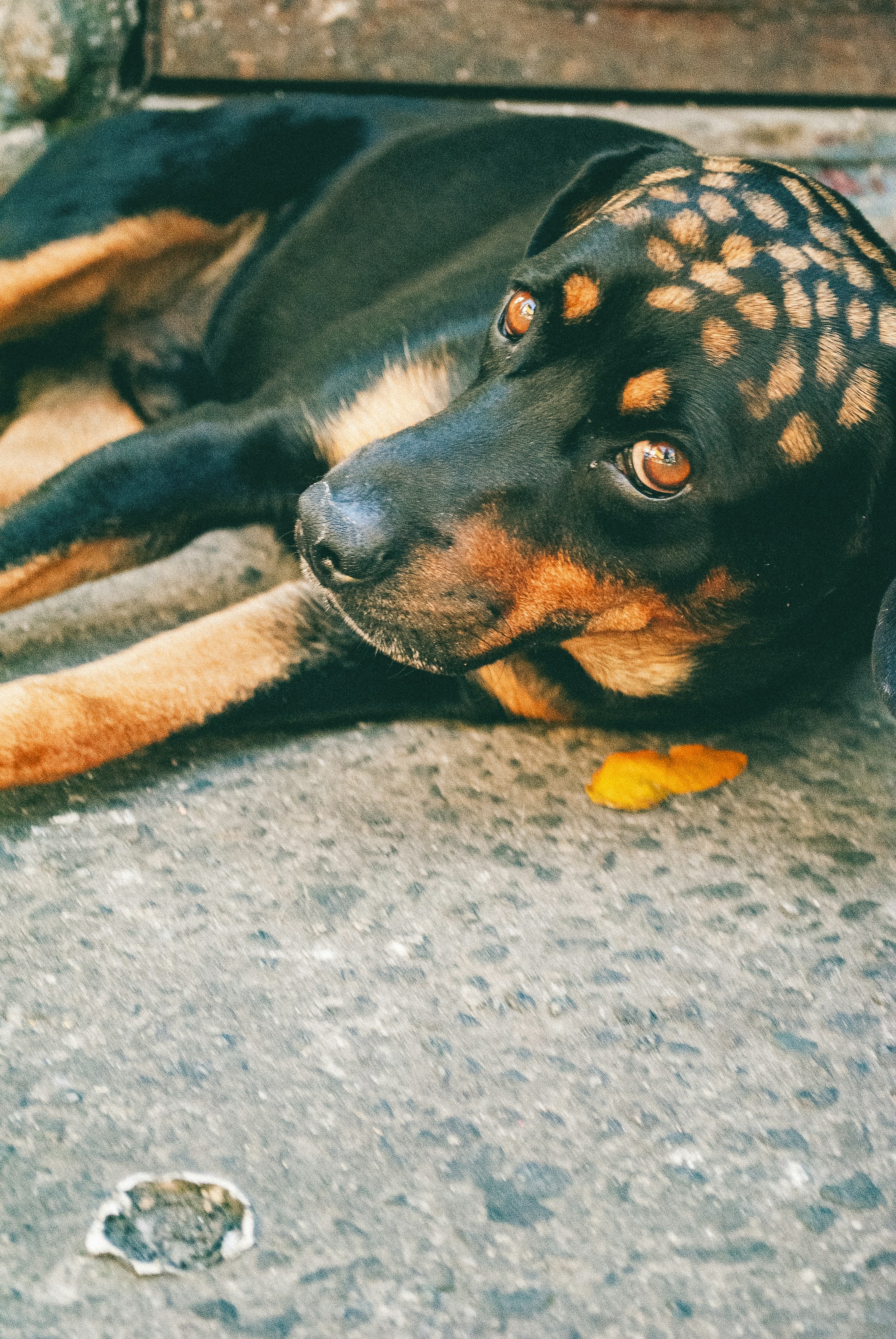 The photograph presents a deep close-up of the face of a stray dog lying on the ground in an alleyway on Rua 4, in the Favela da Rocinha. His head is painted in the “Reflexo” style — a bleaching technique that, in Brazilian favelas, has become a symbol of style, youth, and identity. The painted pattern contrasts with his dark fur — the “capa preta” — and brings the viewer closer to an expression that blends sweetness, exhaustion, and an uncanny familiarity.