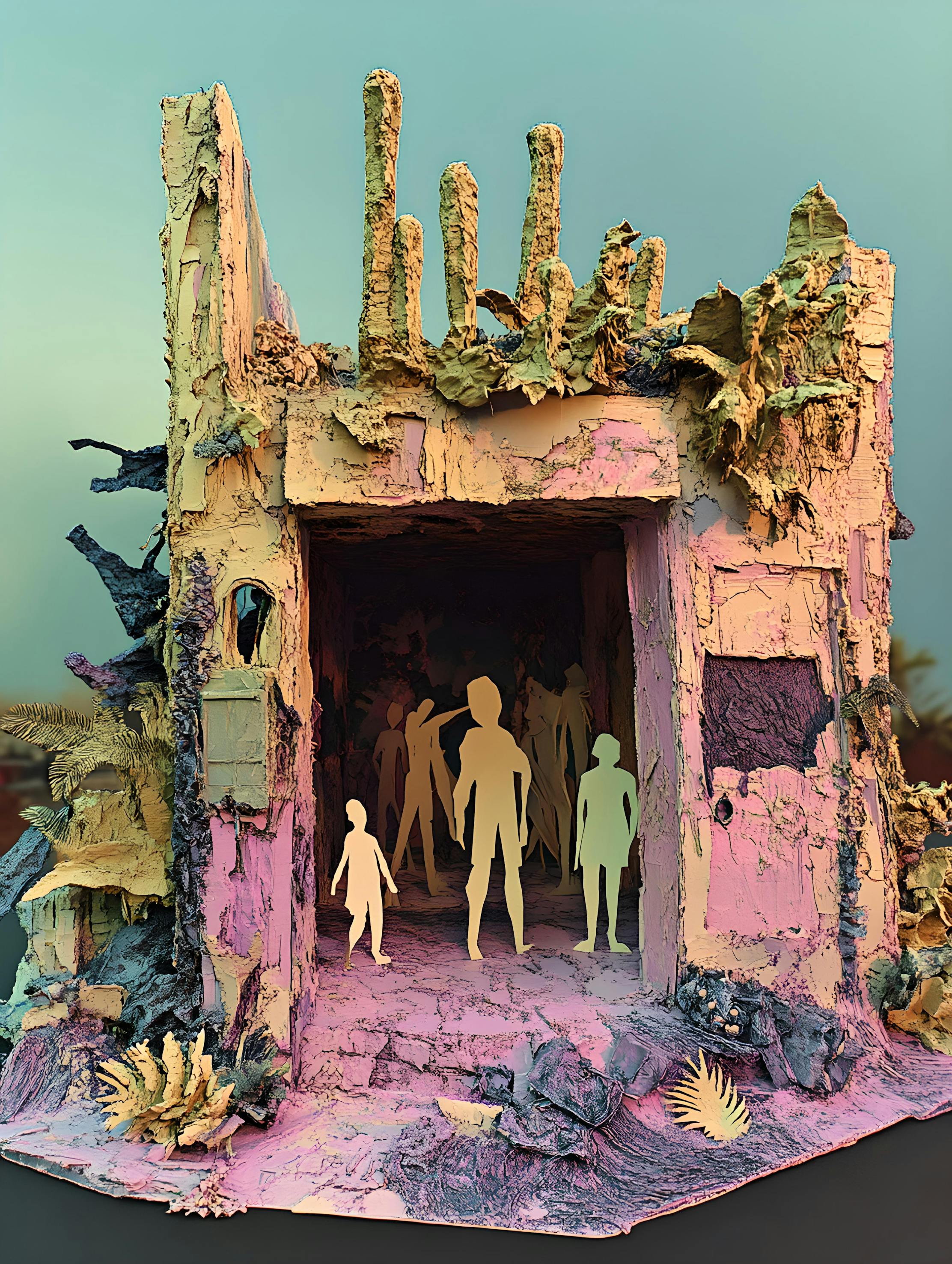 "Lost Souls" is a haunting collection of artworks that captures the essence of desolation and the remnants of a forgotten existence. Each scene portrays faceless figures, anonymous and fragile, wandering through decaying, surreal landscapes. These ghostly silhouettes stand as a metaphor for those lost to time, their identities erased, drifting aimlessly through abandoned, crumbling structures. The architectural ruins, painted in soft pastels and vibrant pinks, contrast sharply with the desolate themes, creating an otherworldly atmosphere. These fragmented environments appear both familiar and dreamlike, as though they once held life but are now reduced to hollow echoes. The textures of cracked walls, collapsed roofs, and twisted organic forms give a sense of impending collapse, yet the figures seem unperturbed, almost resigned to their fate. Surrounding these ghostly forms are twisted trees and barren landscapes, their once-lush forms distorted and skeletal, reflecting nature’s slow decay alongside human ruin. There’s a quiet stillness in each piece, an eerie calm that mirrors the emptiness within these lost souls, who continue to exist without purpose or destination. The pale, translucent figures blend with their surroundings, becoming part of the decayed world itself, emphasizing their sense of erasure. "Lost Souls" invites viewers to reflect on themes of abandonment, the passage of time, and the fragility of identity. It evokes a sense of melancholy, where the vivid colors betray the underlying sadness, creating a contrast between visual beauty and the emotional weight of loss. Each piece is a moment frozen in time, a world where the souls linger, neither fully alive nor entirely gone.