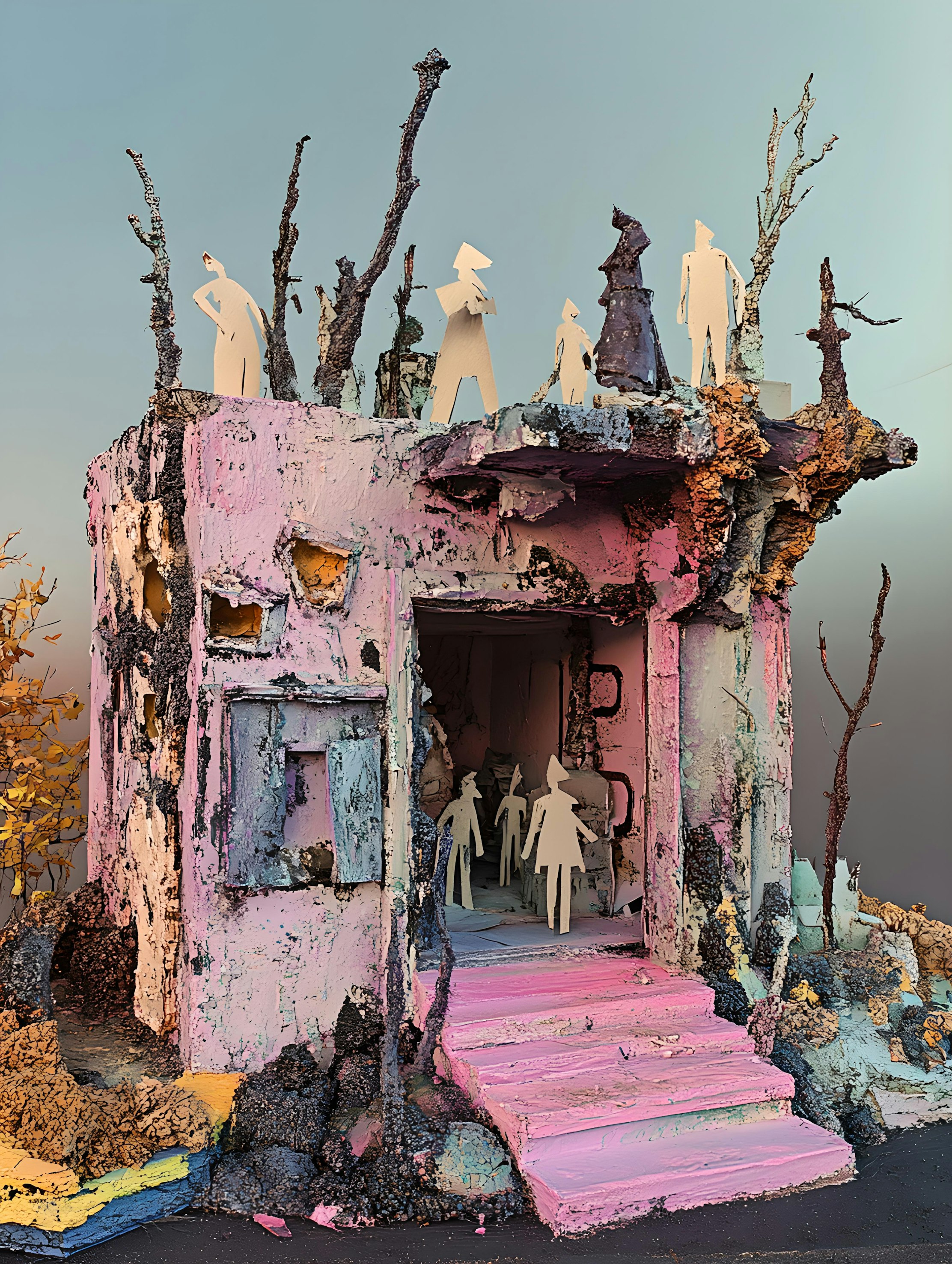 "Lost Souls" is a haunting collection of artworks that captures the essence of desolation and the remnants of a forgotten existence. Each scene portrays faceless figures, anonymous and fragile, wandering through decaying, surreal landscapes. These ghostly silhouettes stand as a metaphor for those lost to time, their identities erased, drifting aimlessly through abandoned, crumbling structures. The architectural ruins, painted in soft pastels and vibrant pinks, contrast sharply with the desolate themes, creating an otherworldly atmosphere. These fragmented environments appear both familiar and dreamlike, as though they once held life but are now reduced to hollow echoes. The textures of cracked walls, collapsed roofs, and twisted organic forms give a sense of impending collapse, yet the figures seem unperturbed, almost resigned to their fate. Surrounding these ghostly forms are twisted trees and barren landscapes, their once-lush forms distorted and skeletal, reflecting nature’s slow decay alongside human ruin. There’s a quiet stillness in each piece, an eerie calm that mirrors the emptiness within these lost souls, who continue to exist without purpose or destination. The pale, translucent figures blend with their surroundings, becoming part of the decayed world itself, emphasizing their sense of erasure. "Lost Souls" invites viewers to reflect on themes of abandonment, the passage of time, and the fragility of identity. It evokes a sense of melancholy, where the vivid colors betray the underlying sadness, creating a contrast between visual beauty and the emotional weight of loss. Each piece is a moment frozen in time, a world where the souls linger, neither fully alive nor entirely gone.