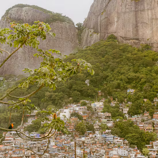 O Tukána — nome do tucano em tupi — repousa sobre uma embaúba, árvore pioneira que brota em áreas devastadas e simboliza resistência e renascimento. Nativa da Mata Atlântica, ela cresce ao fundo da favela da Rocinha, que descansa sobre o Morro Dois Irmãos, formação icônica do Rio de Janeiro.