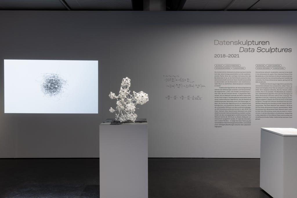 The answer to that question is in this research paper. (For the sculpture shown below), we indeed did build a formula, that is displayed on the wall in the museum, and the one you see in the paper as well, that mathematically captures the evolution of the data sculptures. It does so by minimizing the total link length, which pulls nodes connected to each other closer and reveals communities.