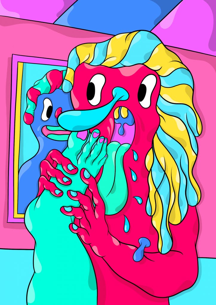 Mix feeling between my dark side and my bright side. My scary characters and the organic forms represent the abnormal universe which is brought into light through colours.