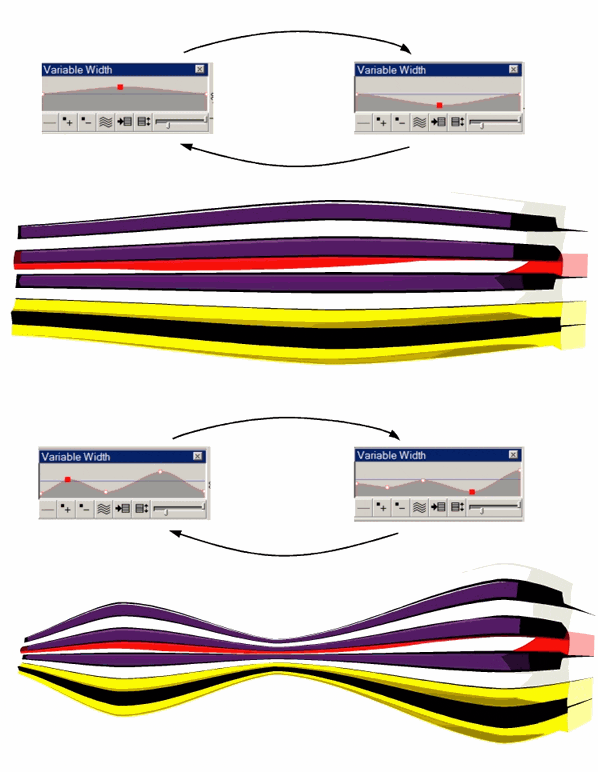 Because the width curve can be easily and smoothly changed by manipulation of control points (red and white points), it leans itself well to use in animations. Bellow I made two examples of tweening back and forth between 2 curves — the number of frames between two states can be made arbitrarily large, here 16 frames will do the job: