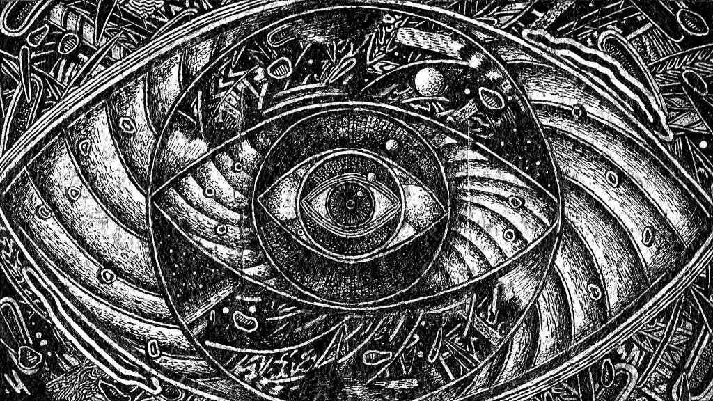 Fried anchors the narrative at the center of the composition, where different permutations of an eye guide our perspective through a sequence of terrestrial and celestial landscapes that has no definitive beginning or end. The presence of the eye reflects the artist, who meditates over the surface for an extended period of time and witnesses its evolution from a blank slate to sedimented layers of ink and white-out.