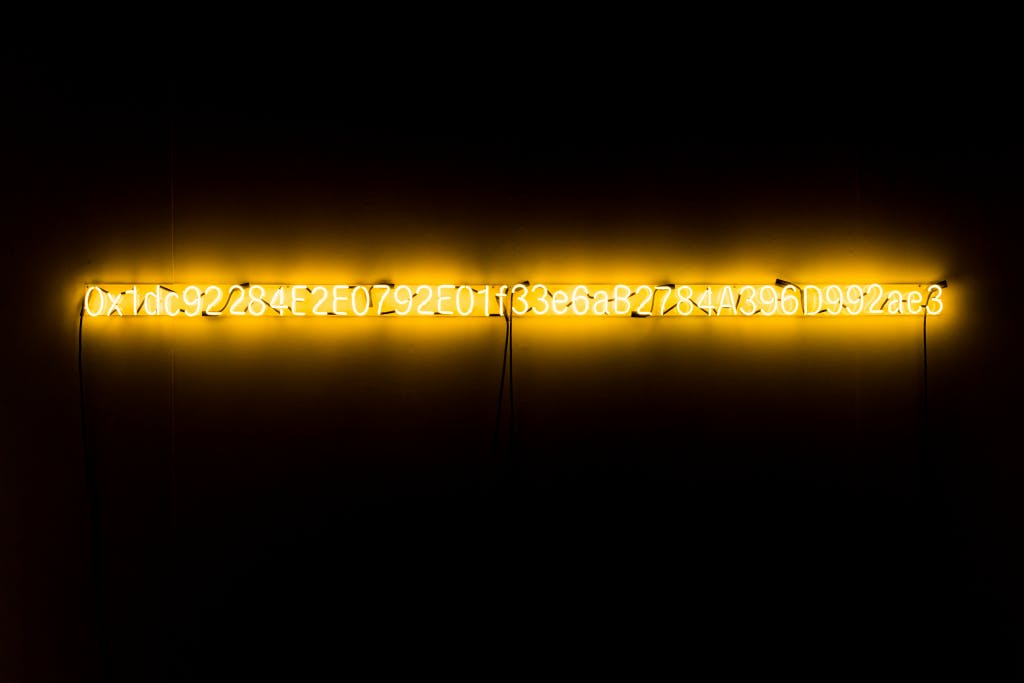 Looking to the blockchain as a canvas, Abosch continued to pioneer conceptual works that challenged the crypto zeitgeist. The next series of “generative proxies” created in 2018 earned the title “Yellow Lambo.” The series was created in response to the overwhelming aspirations of wealth that Abosch observed among collectors and creators of CryptoArt on Twitter. The Lamborghini was identified as a metaphorical vehicle of success and its acquisition confirmed ultimate wealth. Abosch created an ERC-20 on which he issued a single crypto-token “Yellow Lambo,” represented by the symbol “YLAMBO.” The project was not attached to any media but existed so that he could create a yellow neon sign comprised of 42 inline alphanumerics that referenced the “Yellow Lambo” contract address on the Ethereum blockchain. As the artist continued to explore the nuances of the metaverse, he began to consider smart contracts with the same deft handling as “Potato #345.”