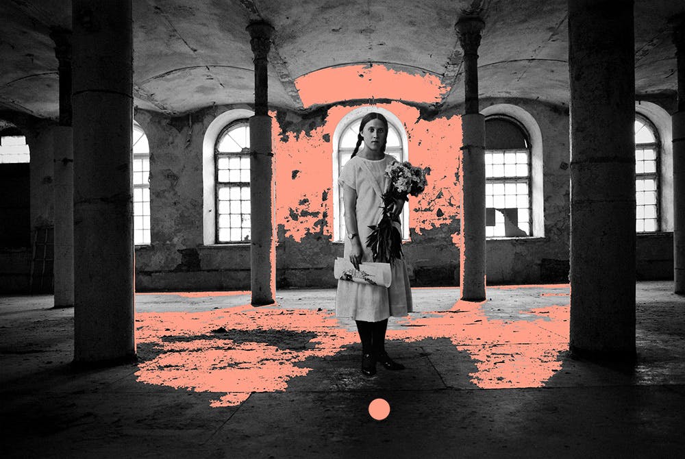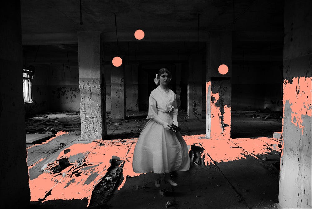 Manipulation with viewer mindsets lies in the control of the viewer’s attention and guessing riddles through layers, colors, and movement. This is achieved by using pink dots and layers, the background of large abandoned rooms, and images of mysterious ladies. Reflexively, the spectator explains for yourself the meaning of each picture.