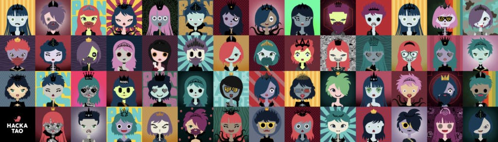 Similarly, Hackatao’s recent project, “Queens + Kings,” incorporates blockchain technology as part of the medium, utilizing smart contracts not simply as a means of validating artwork, but as a creative tool. An avatar project in collaboration with NFT Studios and Sotheby’s, and stylistically inspired by their earlier work and the culture of the metaverse, it is intended to give collectors an artistic and interactive experience, “to subvert the…traditional dynamics of ‘an artist creates and a collector collects.’” In more conventional avatar projects, character traits are assigned to each token by an algorithm and are then unalterable. While this is the initial case for “Queens + Kings,” after the first mint, collectors will be able to hack their avatars, so to speak, to take them apart, customize them, and put them back together. Traits are interchangeable, meaning that collectors can buy and sell them; the result is that tokens, which are already rendered unique because of their smart contracts, are even more singular and specifically personal. The project is designed so that Hackatao can continue to release new traits as it progresses, meaning that the possibilities are truly endless.