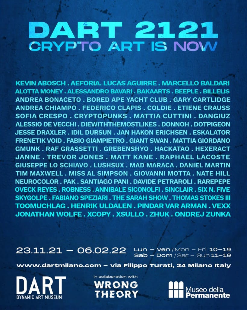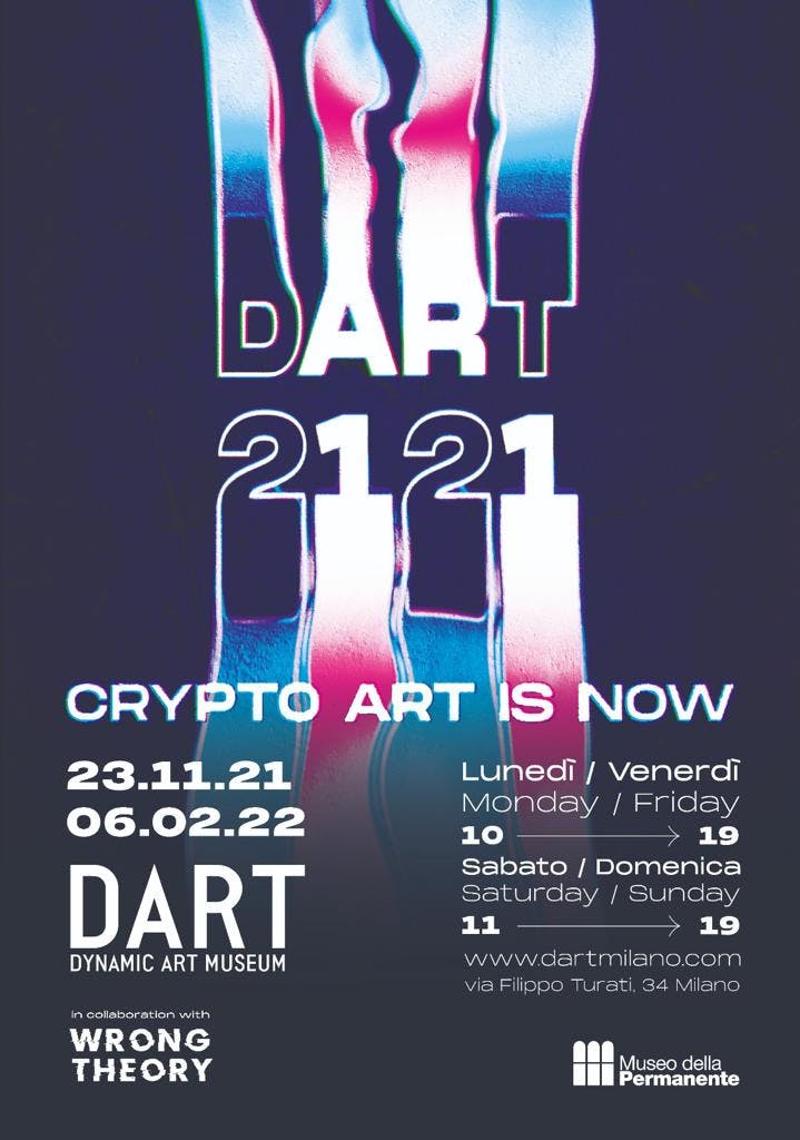 From 23 November to 6 February 2022, DART Dynamic Art Museum, an innovative museum project conceived by Piergiulio Lanza and architect Riccardo Manfrin, and WRONG THEORY, the first real life production in the NFT world, formed by the union of Alessandro Brunello, Founder of the exchange Bibipom.com and InartNFT.com exchange, Alan Tonetti, Founder of Stardust S.p.a. and CEO of TaoDust and Serena Tabacchi, Director of MoCDA, Museum of Contemporary Digital Art, have brought the largest collection of NFT works to the historic spaces of the Museo della Permanente in Milan.