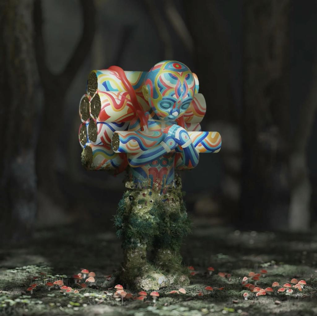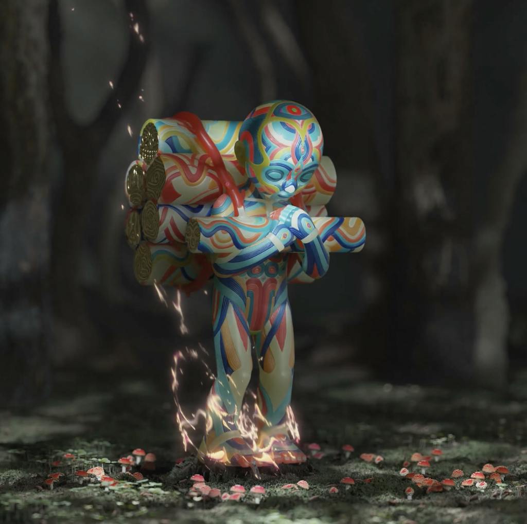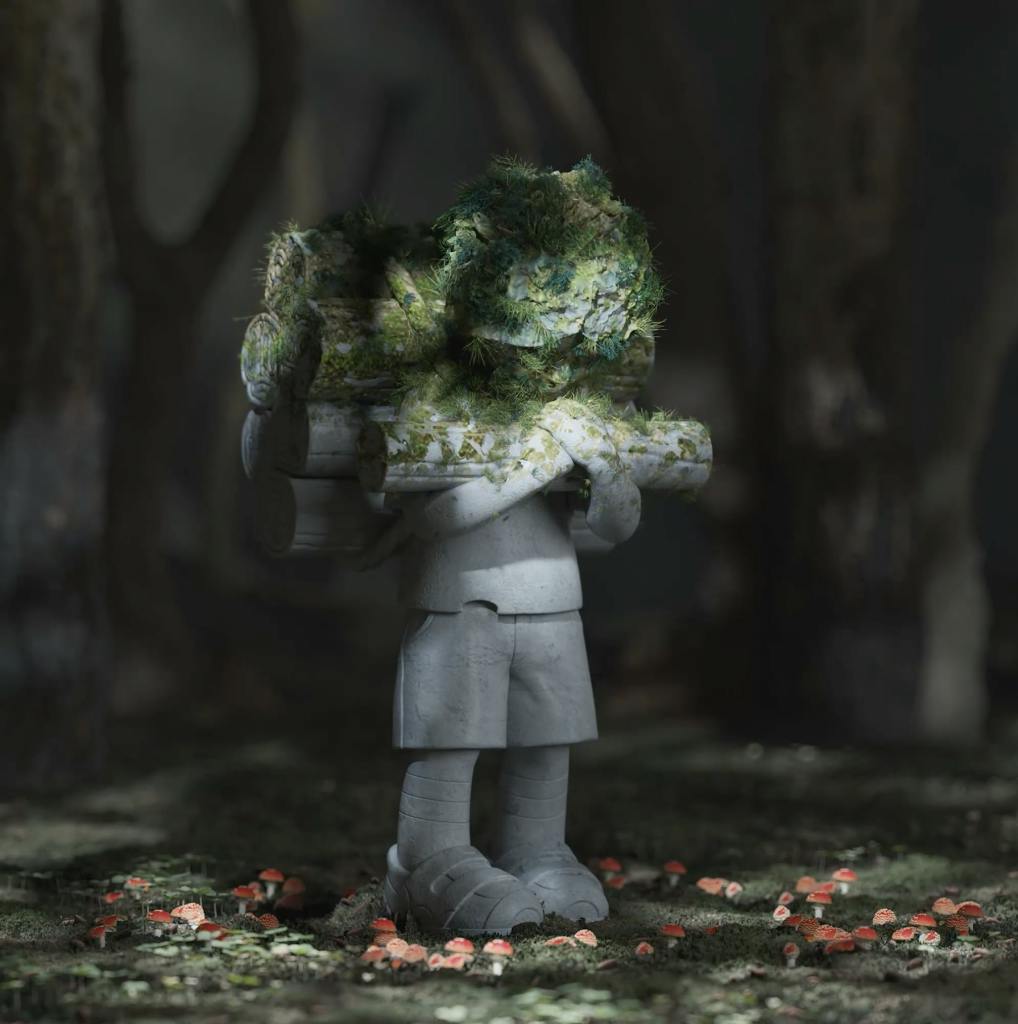 While known predominantly for painting and illustration, “Woodcutter Awakening” isn’t Jean’s first digital piece. He is enamored with the processes and challenges involved in collaborating on 3D work. “There’s a lot of similarity between both approaches,” Jean told SuperRare. “When you’re engaged with the canvas, there’s just a lot of push and pull. Pushing elements away and then bringing them back out.” He likened this back-and-forth between artist and canvas to the conversations he had with Corzine in creating the final version of the piece.