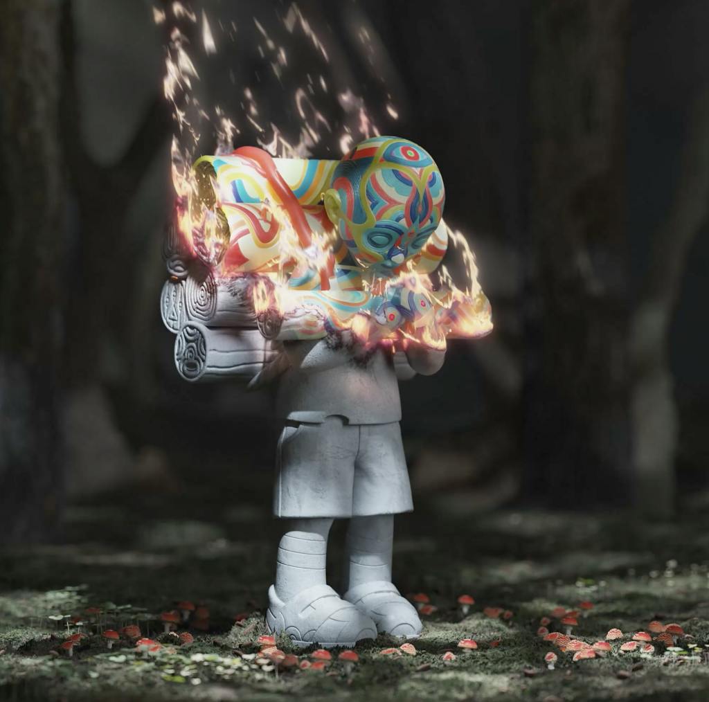 The woodcutter’s latest iteration pulls from Jean’s past renditions while also incorporating the nuances of its change in medium. Through 3D animation, Jean accesses the solemn humanity of “Kindling” and “Offering,” contrasting it against the psychedelic whimsy of “Kindling III” and “Kindling V.” The introduction of a young boy ablaze imbues the deeply personal leitmotif with both fantastic vitality and enchanting tension. As one witnesses the measured immolation of the subject’s stoney flesh, reminiscent of Malcolm Browne’s haunting photograph of the burning Buddhist monk, Thích Quảng Đức, one is held in that meditative grip by the atmospheric soundscape of record producer Nosaj Thing’s hypnotic accompaniment. This haunting incongruity serves to reassure the viewer, prompting them to consider the origins of the flames, while the work’s title offers another clue. The woodcutter’s eyes may remain closed throughout the entirety of his phoenix-like transmogrification, but the first bit to emerge from the flames is an open eye situated atop his head. It is here that we touch on the manner in which Jean views who he is: “I guess it’s kind of like a stoicism in a way. If you’re able to get yourself in a mindset where you’re not affected by frivolous things, you can get through anything. And that’s how I sort of see myself.”