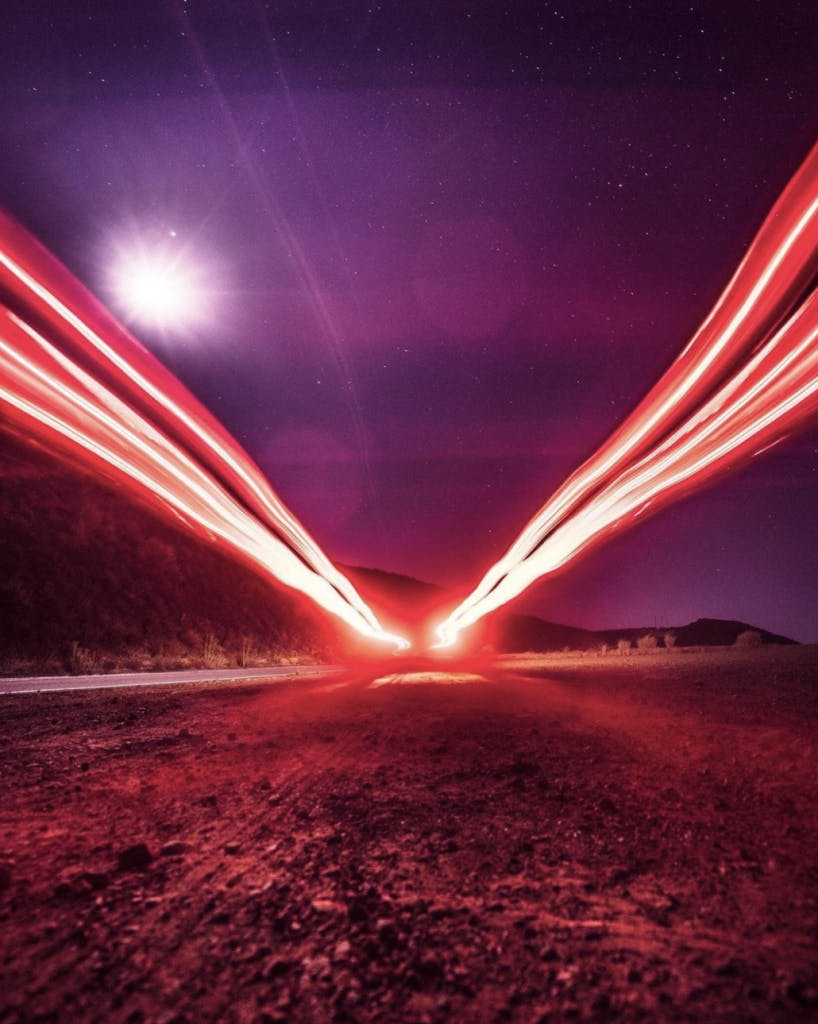 For the last two decades, 2wenty has worked in the solace of night, illuminating winding stretches of the highway into a tableau on which to paint words. Conjured by masterful wizardry, bars of light dance across the pavement, disappearing as quickly as they emerge, whilst a celestial tapestry cloaks an indigo sky as the haze of a dense city is left behind. Walking along a road nestled between lush mountains, the artist paints one letter at a time to capture a long exposure photograph while remaining keenly aware of the possibility of an oncoming vehicle rushing at lethal speeds, or a chance encounter with a hitchhiker, each yielding little warning. The juxtaposition of film and language creates a kinetic tension that charges the words with a sense of urgency, calling to us to get on the road and run away to anywhere but here. Locations with unknown coordinates are secondary to the method and the message. Viewers experience the words as if rushing down the highway through 2wenty’s eyes and feel a haunting familiarity as if they may have once traveled there after making a wrong turn, or collected a vestige from a dream about trying to escape.