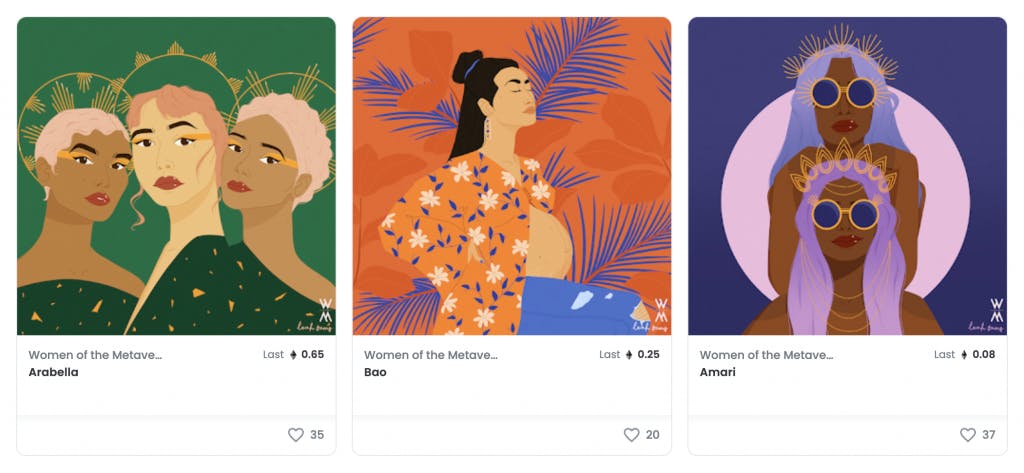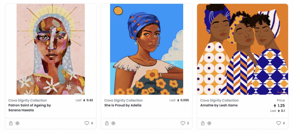 Many female-led projects are not just about making money, but focus on social impact. While large organizations and PFP projects are gaining recognition and launching major collaborations, there are many projects out there that are opening up space through representation and community. The Power of Women is an NFT movement of bold, diverse, empowering artworks by illustrator Leah Ibrahim Sams. Her aim is to bring inclusivity into the space and open up channels for conversations around taboo subjects such as postpartum depression and abortion. Sams has worked with The Cova Project, an Australian charity providing safe sanitary solutions to women in developing communities across Africa. The Cova Dignity project is available on Opensea and features donated work from socially minded NFT artists.