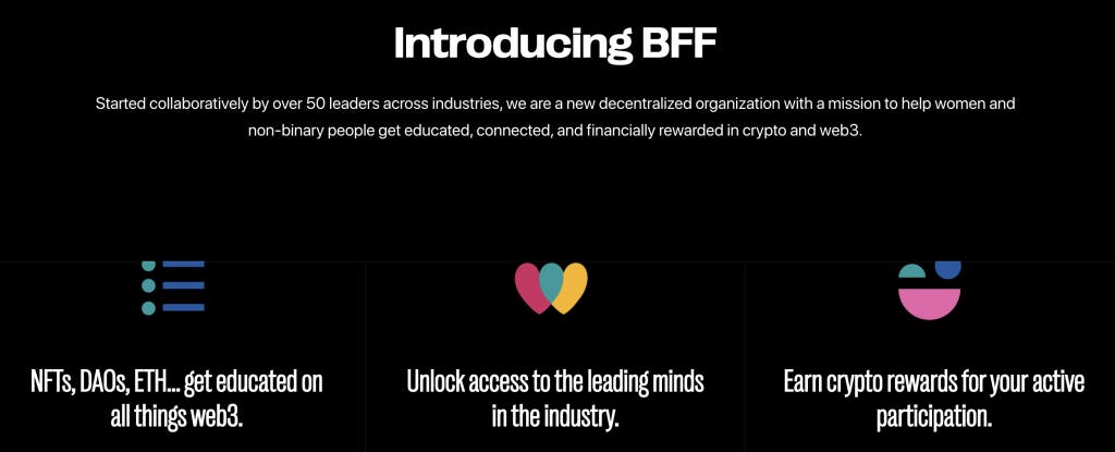 Web3 has huge potential to be an equalizing force for those historically marginalized by existing systems. Through education, connection, and rewards, we are excited to grow a strong, equitable community in BFF. Jaime Schmidt, Co-founder of BFF