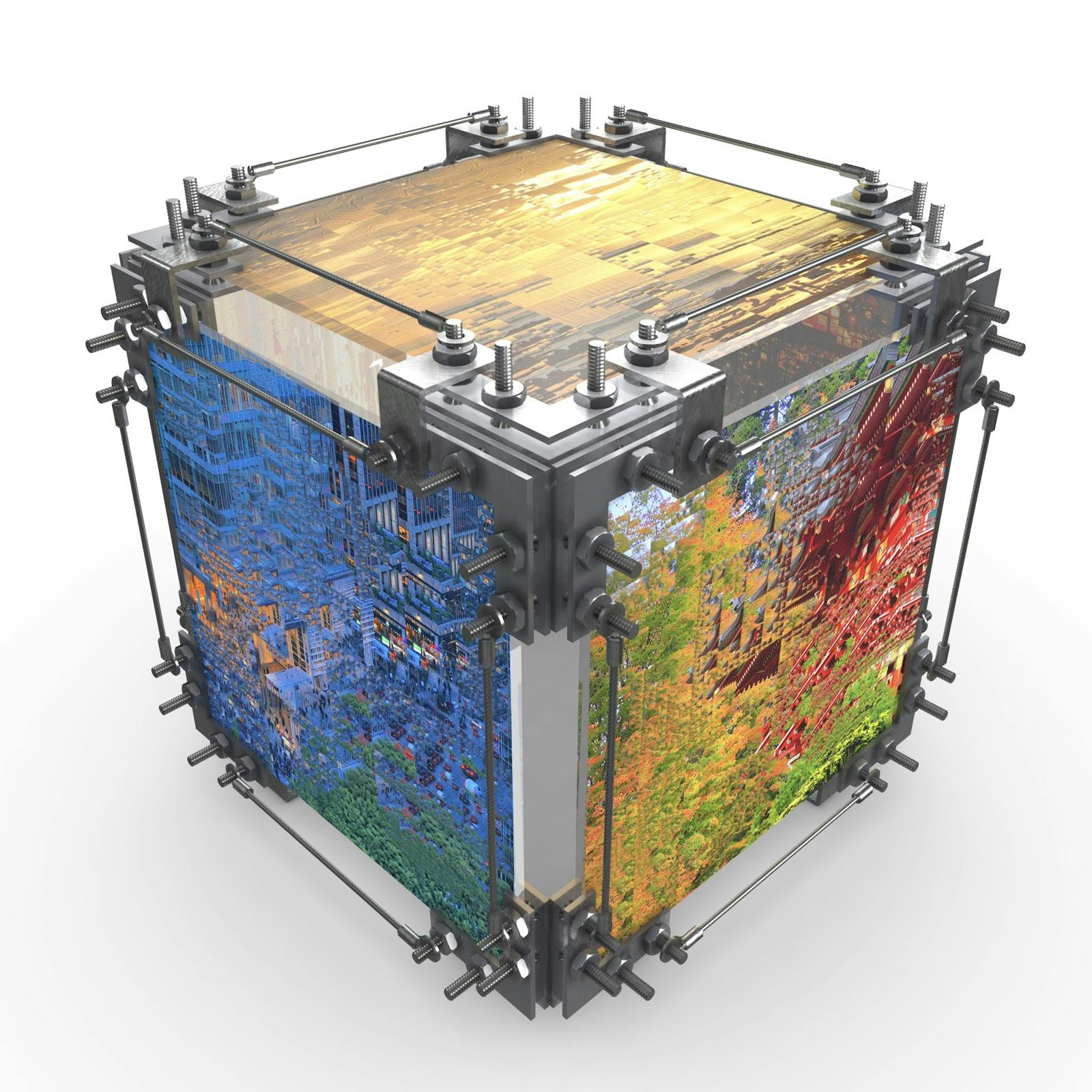 I understand why you’ve asked that question and it reveals an interesting aspect of art appreciation. It’s natural to wonder what an artist has in mind when observing this kind of dissonance and visual tension. Sometimes, however, the answer may be less mysterious and more mundane than you expected, and I hope my answer doesn’t disappoint you. The truth is that I learned early during this project that my Dreamscapes are rich enough to find/extract multiple compelling details from a single scene. When I was accepted as an artist on SuperRare, as a digital-native art platform I thought hard about ways to showcase my art that took advantage of the variety of file types SuperRare supports, now including interactive 3D objects. Years ago, I created my award-winning “Architectonic Photo Cube,” a novel way of displaying photos printed on glass that I dreamed up in the summer of 2011. I thought this might be a great way to showcase my Dreamscape Details and, in the process, express my former life as an architect and 3D graphics researcher. So, I repurposed this design to showcase multiple art pieces in a single art object, one which I hope someday will be experienced at super scale (e.g., 8 feet per side) in a virtual reality gallery setting.