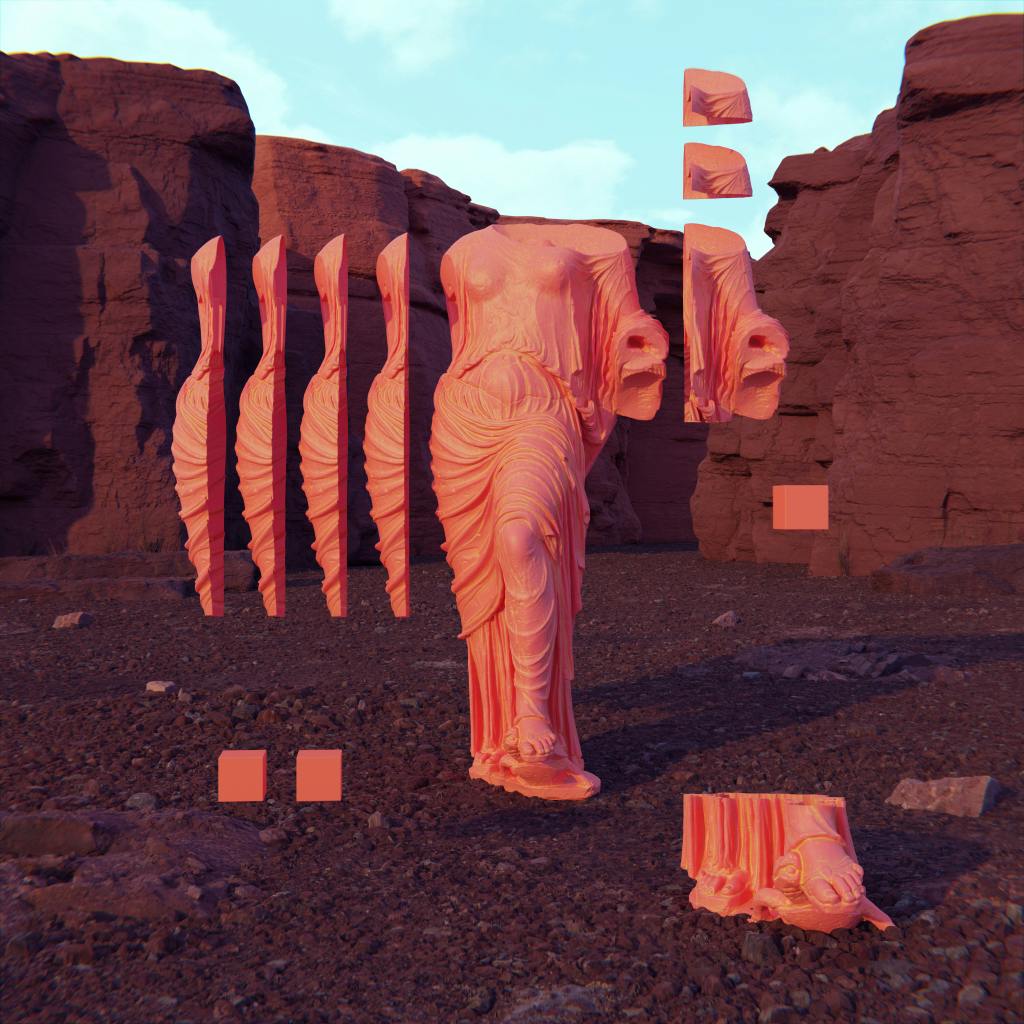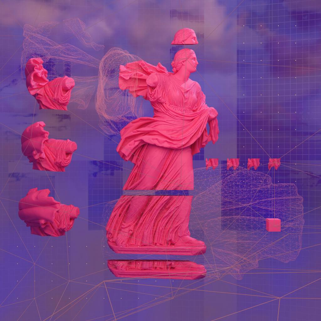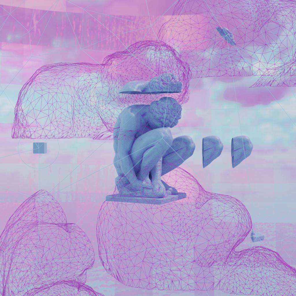 I’d like to share a little bit of the process of the most recent series of images I’m working on. As I mentioned before, I’m thinking about the objectuality of the digital, the measure with which we can decide how real the digital is. In this series of works, I’m placing 3D scans of classical sculptures in what I like to call an “unstable environment.” These environments show their “ins” through error. They’re full of elements like blown-up fragments that show their structure, intertwining with the main figure, or decimated sky textures, modified to almost look like abstract backgrounds. The main figure itself is also broken using a pattern that deliberately emulates machine error. I want to explore an aesthetic of uncanny realism, taking advantage of the contrast between the cultural heritage of these classical sculptures and the digital milieu they’re thrown into. These works are a part of the series “Skies” and will be available on SuperRare.