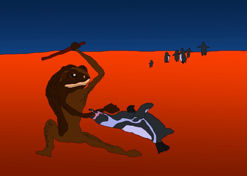 This work reminds me of the Rare Pepes. It has a dank coolness and I love the colors and the composition. There’s some weird shit happening I want to understand. Are those penguins in the distance? Are they coming or going? Are they helping or fleeing? It’s violent and funny-cute at the same time, which I adore.