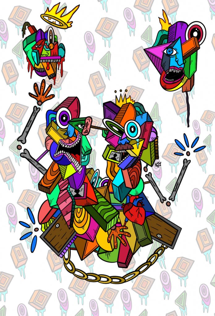 One of my favourite, and who I believe is one of the most under-appreciated artists, is HarvMCM. His recent SR debut with ‘Discover your subconscious” followed by “Alone but together” highlights the systematic destruction of the character in his artwork. The fragmented George Condo and Basquiat-esque cubist plane styles are clearly embedded in HarvMCMs work.