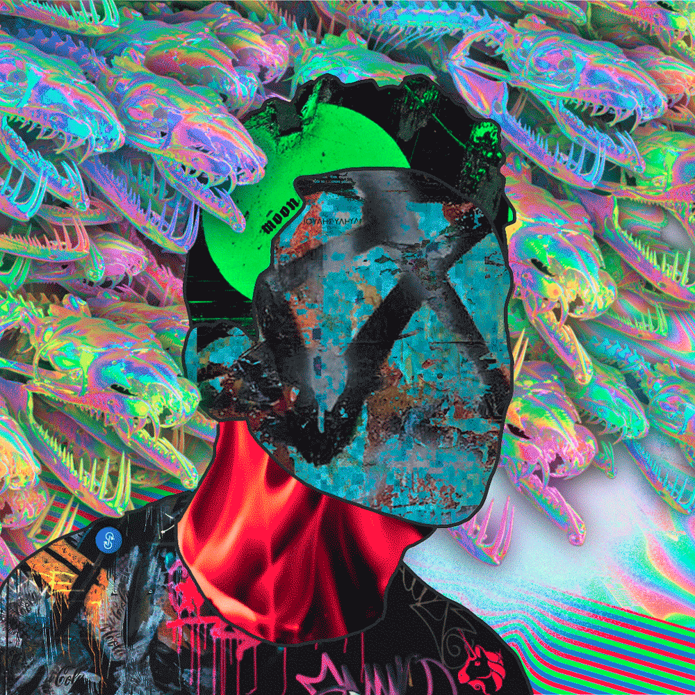 Most of skygolpe‘s previous faceless men were melancholy & calm, covered by paints of a more traditional style. While neurocolor‘s art is often neurotically colored (acid, vaporwave, psychedelic are the hashtags), dominated by fierceness, violence, skulls and skeletons. Considering the previous styles of the two artists, this is a collaboration I’d never expected to happen. But I’m even more surprised by how successful it turned out: retreating to the background and giving the central stage to skygolpe’s faceless man, yet neurocolor is the one in control. He gives a total alien force and identity to the faceless man, becomes the “evil voice” on the back of his mind, and completely drives out the violence & craziness of skygolpe’s classic character.