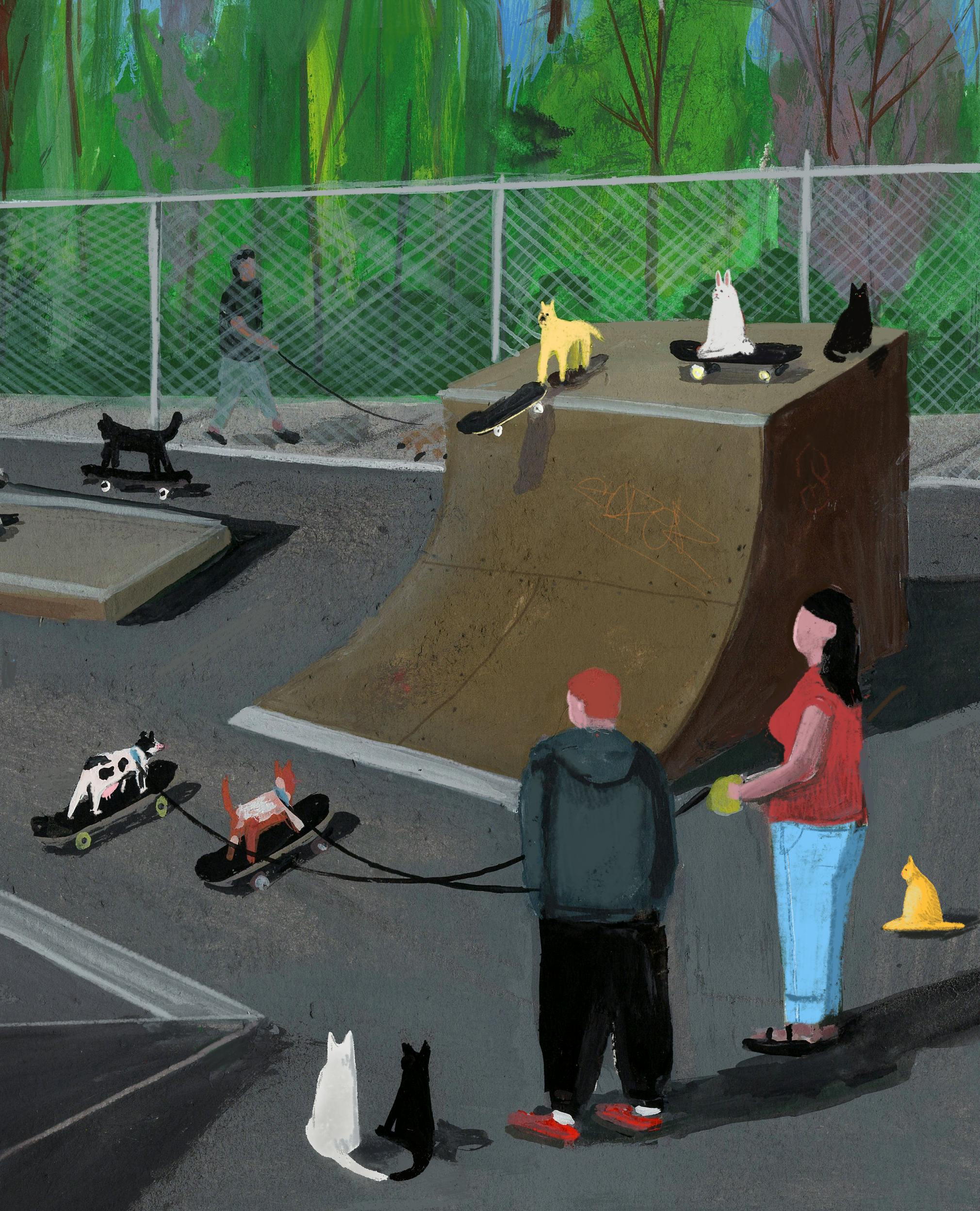Jonathan Wolfe’s humor wins. This time he sets out to a pet park (weird animals again!) I’m amazed at how normal he makes the painting look. It’s like the most serene and normal afternoon, you encounter a normal park, where normal people walking their normal dogs and cats. But wait – why are these dogs and cats skateboarding?! Remember to check out All Paws on Deck, I believe he’s one of them.