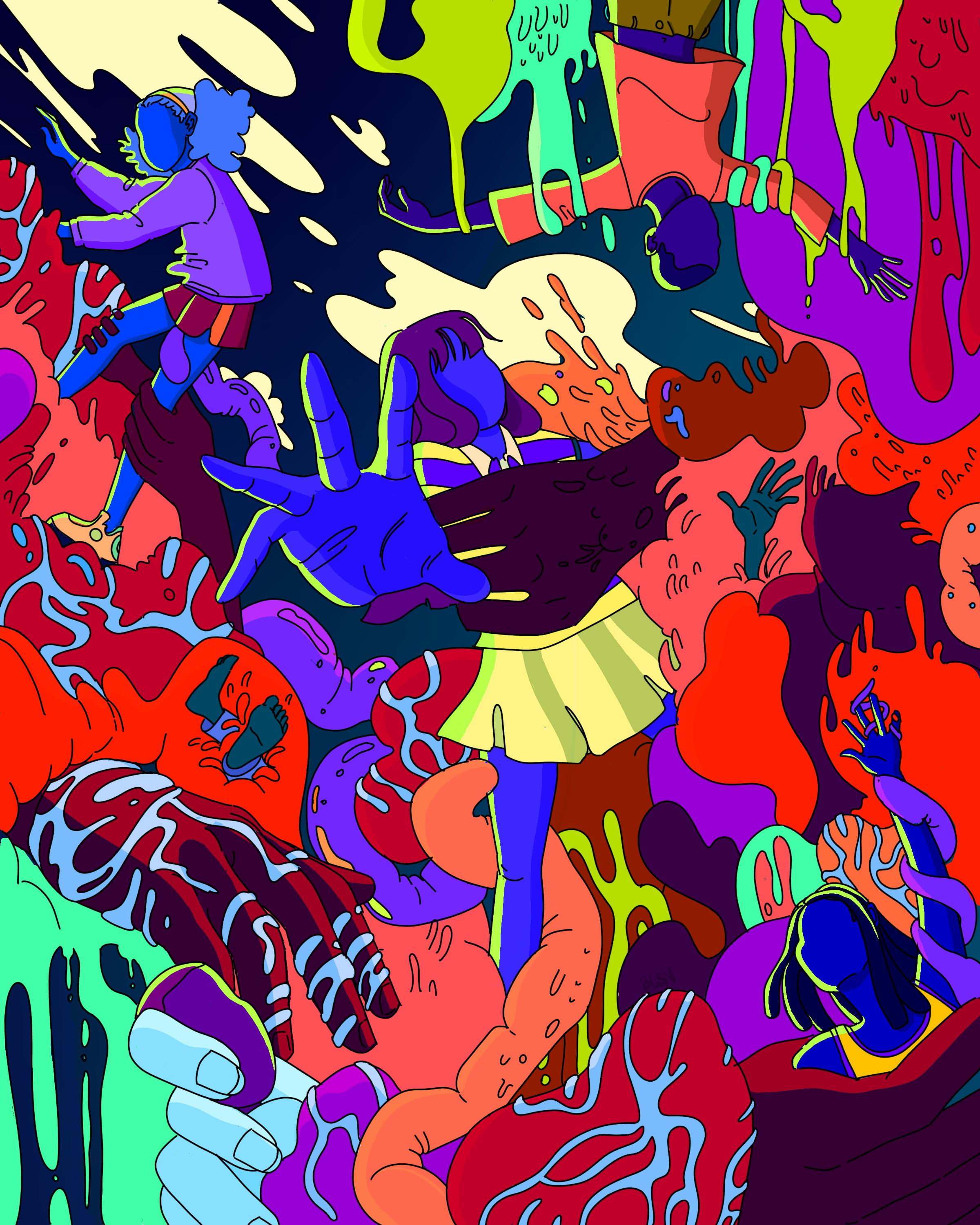 blacksneakers never disappoints. This time she goes more abstract and emotional than her previous work. You can see enlarged hands, enlarged bleeding hearts, struggling human figures trying to break free from the “collective angst.” Very strong emotions are conveyed through rich colors deployed in luminous, flat planes. The colors are released from the task of naturalistic description, and are therefore capable of developing an enormous power of expression. These are the colors of her inner world.