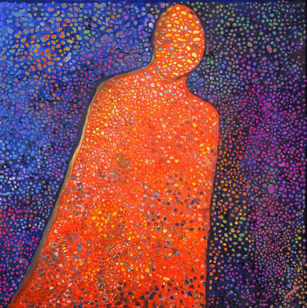 Gustav klint and Yayoi kusama, both of them have heavily influenced my work. Klints mix of figure and colorful abstraction touched me deeply, I love mixing the human figure with bright colors and I really think my style took off after viewing his work. As for yayoi , her early “net” paintings inspired me to twist her concept of using small circles to create paintings so large they become almost environmental in nature consisting of just small circles and a solid wash of background color. I made it my own by filling the circles in my paintings with many different colors bordering on pointillism.