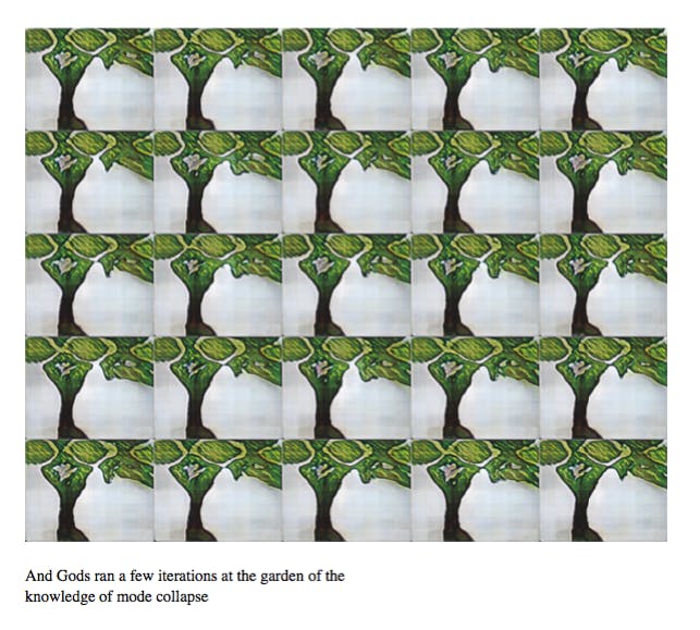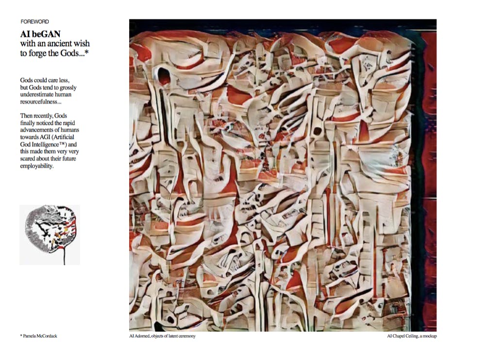 In terms of composition, The Book of GANesis mirrors the design of a graphic novel and in turn introduced a new genre altogether: GANcomics. A GANcomic follows the idea of using AI-generated artwork to steer the narrative of a book and in place of traditional imagery. In this case, Sarin allows her AI models- trained on her own drawings, sketches, and photographs- to steer the narrative of The Book of GANesis. She credits her inclination “to find patterns and meaning in random information” to her role model Lynda Barry. As for a literary theme, the book decidedly parodies religious text, carrying a theological trope Sarin attributes to a well-known quote by Pamala McCorduck, “AI beGAN with the ancient wish to forge the Gods…”