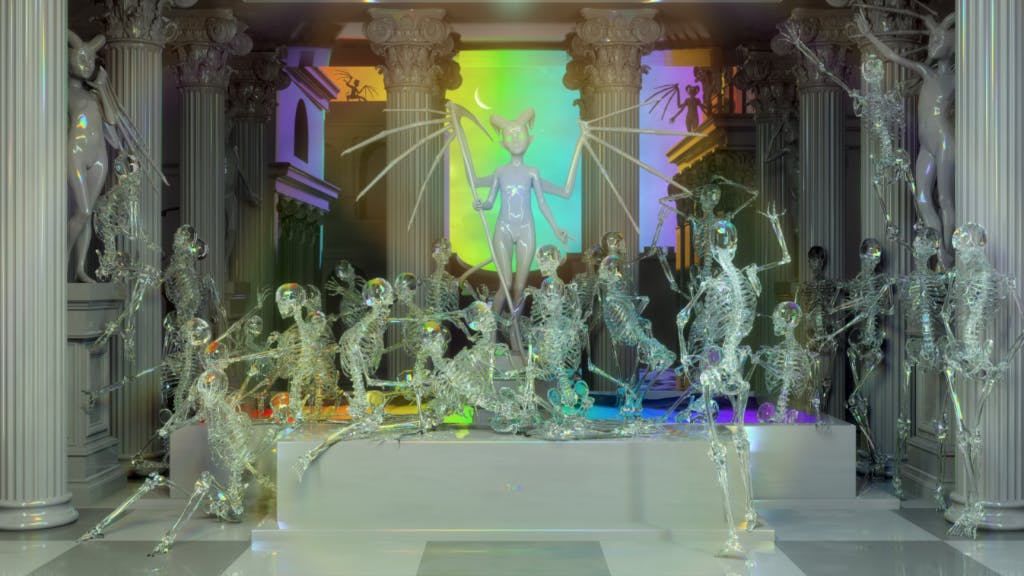 Unlike most pictures of god Saturn (mostly a masculine, elderly guy), here Saturn looks feminine, preteen, something between a fairy and an alien. Despite of being a sacrifice, the dead seem to be having a celebration, receiving the gift of “the present in which everything always has and always will exist.” It’s not surprising though, as big holiday is often associated god Saturn. Hence the whole mood is ironically cheerful – a bunch of dead skeletons celebrating the long lasting of the moment.