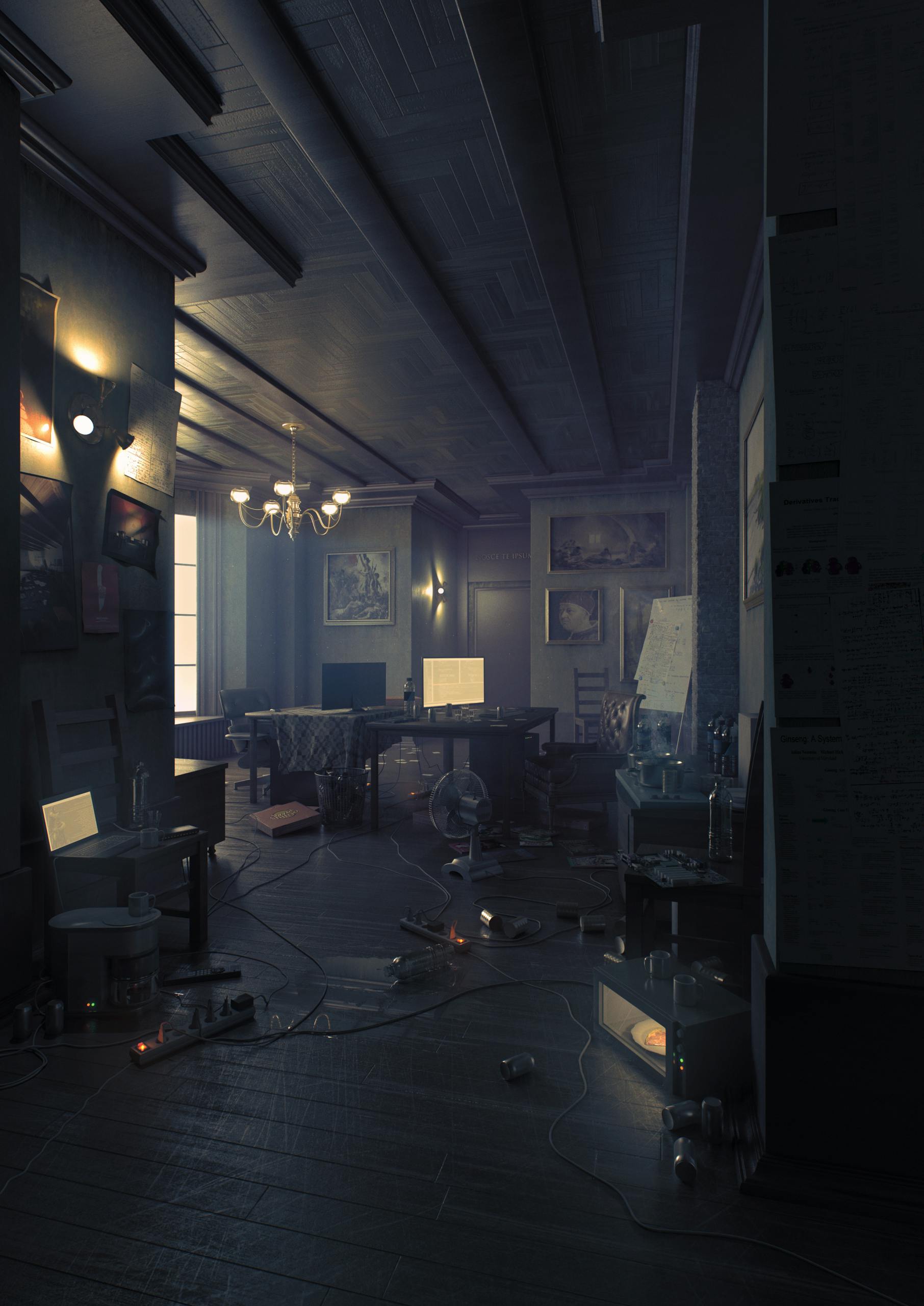 The room is so full of details. You see computers with their screens on, as if someone just left their work half done minutes ago and will be right back. There are cups left with coffee, half empty water bottles, beer or red bull cans, microwave with its light on and some food in, power strips (still on, too), messed up electric cords across the floor, notes and papers pasted on the wall, an electric fan. It’s just like one of our rooms that are filled with the most familiar everyday stuff. But it also looks so strange and unfamiliar, totally uninhabitable. The bad lightings, old chandeliers, old famous paintings like “Liberty Leading the People” hung on the over crowded wall. The floor seems to be dusty. And the familiar everyday stuff are more like debris. It’s like a dusty dream of things we know but entirely illogical.
