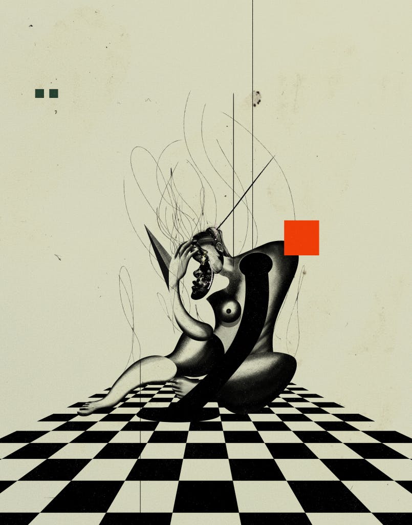 This time Etiene reduces his use of color to only black and white (maybe not white, what is that color called?) to convey the feeling of extreme “coldness” & “emptiness”. He still uses the simple 2D plane to construct a 3D space – it’s either “your house” or “my empty soul,” or maybe even both, where it has no clear boundary and seems to expand into infinity. This further increases the feeling of cold emptiness while also leaves the possibility of being an abstract mental space. In the middle is a distorted human body with an even more distorted face. It reminds of Picasso’s multi perspective bodies & faces, except that it’s more rounded and has volume. Emotionally, you can almost feel the pain and depression concentrated around the brain, with the help of the sketch lines. It’s a typical Etiene Crauss piece with its simplicity and intensity, plus the recurring red square. I wonder what that means.