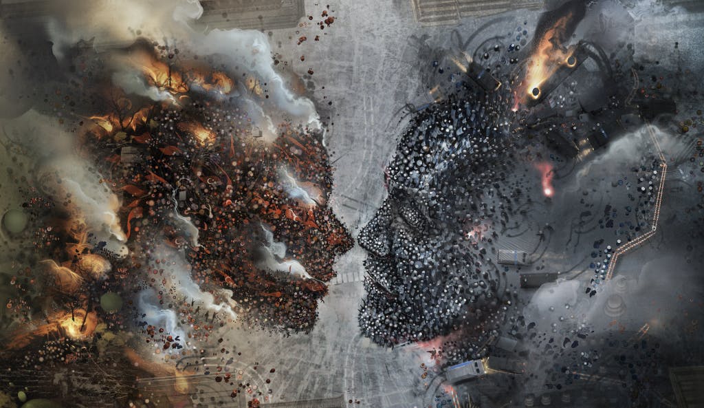Although it was inspired by demonstrations in Turkey in 2013, “Love is a Riot” is, like android_jones says, not less relevant to what we are experiencing in 2020. From the bird’s-eye view, you see two people’s profiles, colored red and blue, close to kiss each other, with their hair on fire. Zooming in, you see two groups of demonstrations on the street, smokes of gunpowder and fire. But it’s not hatred, violence or conflict Jones sees, but love. Poetically says in the description: “The expression of love is one of the greatest mysteries and it manifests in a myriad of phenomena. Love is incredible, love is crazy, love is pain, and ….Love is a Riot.”