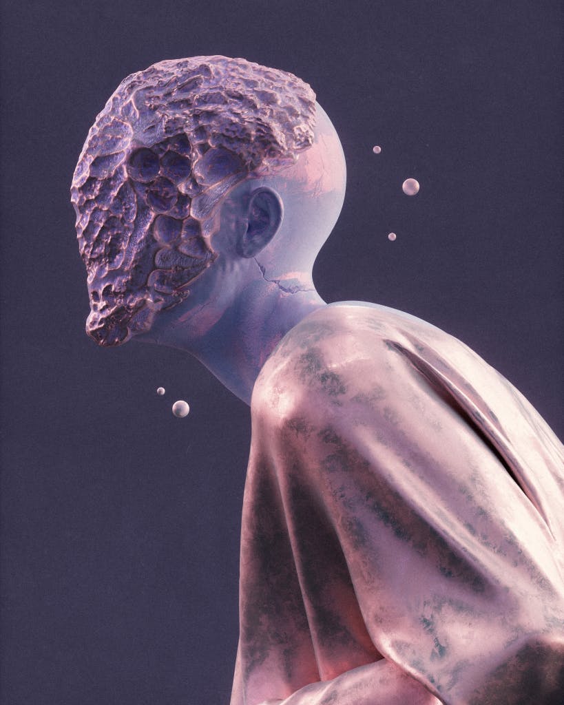 aeforia’s 3D human head/face is chemically eroded like stones. aeforia has a love for faceless (or partially faceless) human figures. They are often mysterious, without clear identity/personality, wearing simple monochrome one big cloth, which is more like a body veil than real clothes. And the purple.