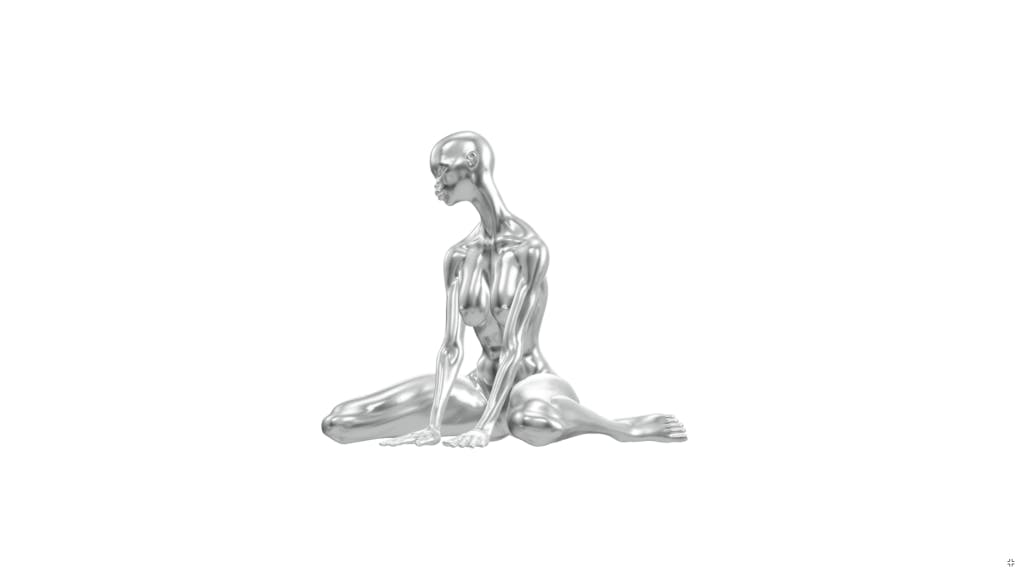 This 3D digital female nude sculpture bears Jason Ebeyer’s signature human form – glossy, sensual, alien-like facial structure, slightly disproportioned for the effect of eroticism body feature; and you can literally see her from every angle. She’s like the digital fashion model of next century.