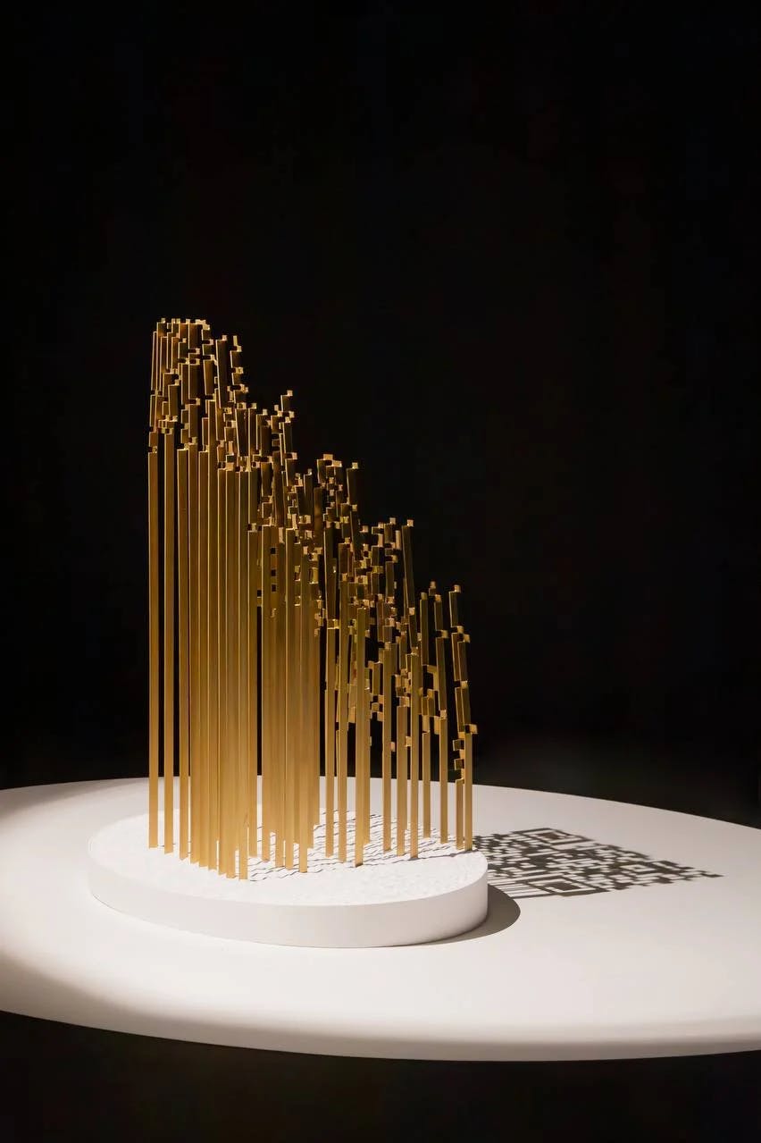 Together with my partner on the exhibition, we started brainstorming. We came up with the idea of using QR codes as a kind of door to something else. Then, we thought about how to use them creatively and smartly. That’s how the sculpture came about. The sculpture had light rotating around it in this immersive room we designed. When the light aligned, boom—the QR code would appear.