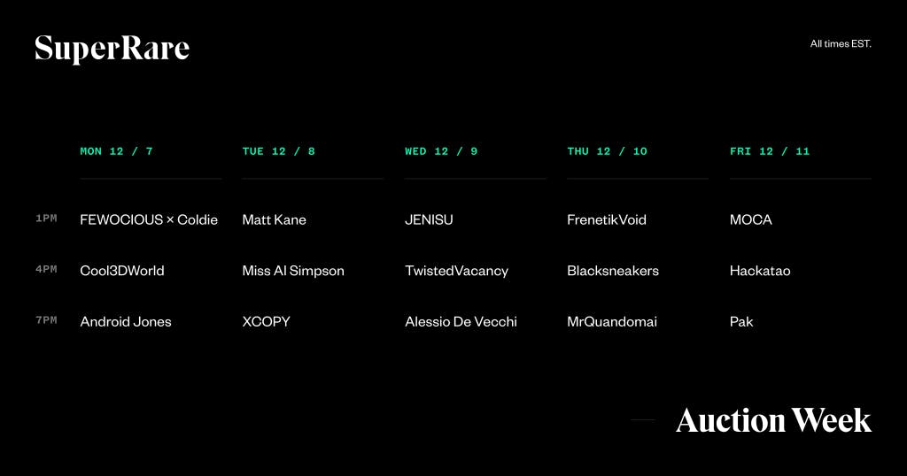 We’re kicking off the launch of our next-generation auction system with this weeklong special event featuring some of the best-known digital artists, as well as our largest collector to date, Museum of Crypto Art. Each day, three auctions will kick off, showcasing world-class digital art powered by our new on-chain Auction House software.