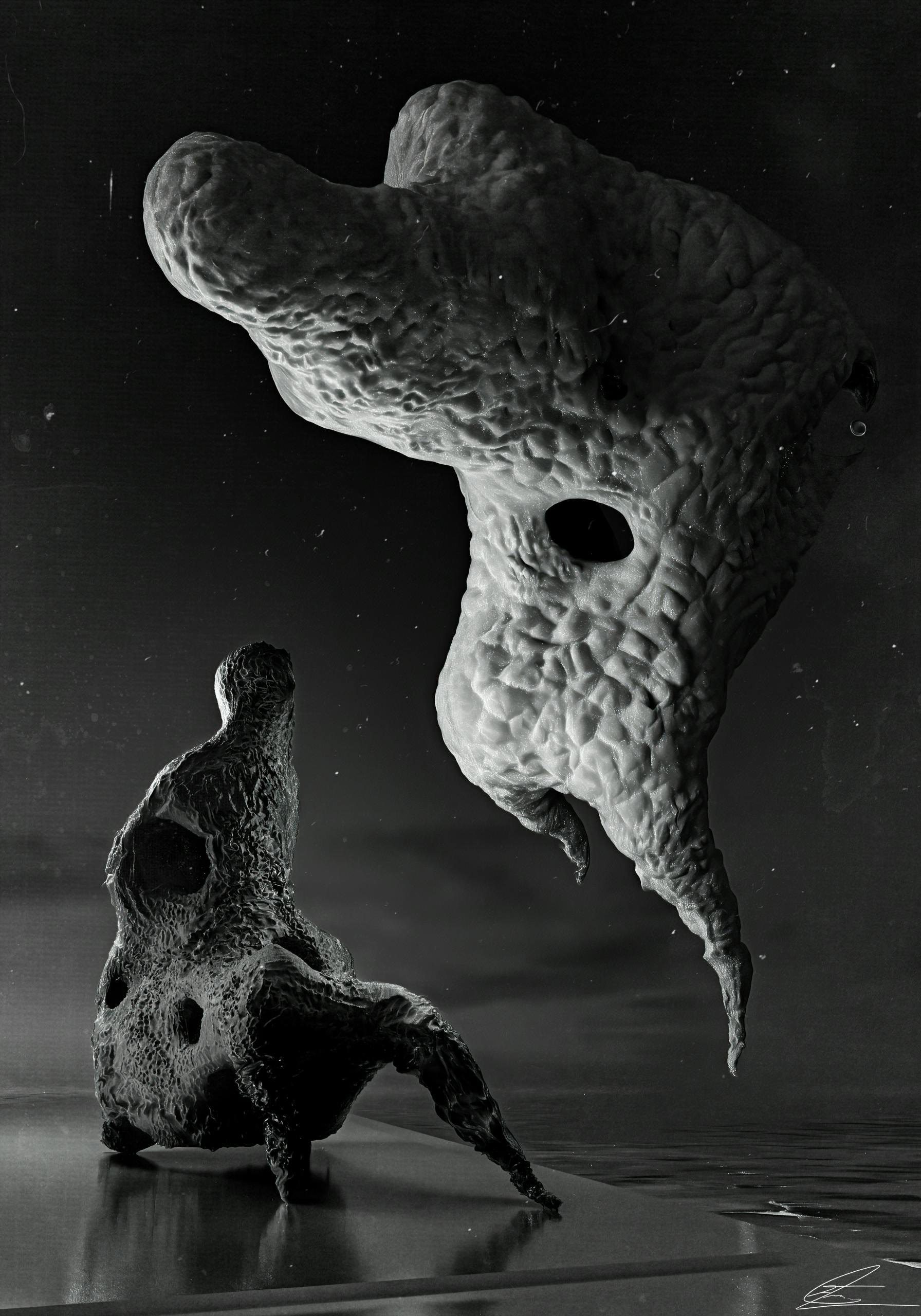 A rare black & white Frenetik Void and also a rare instance where there is no clear human figure. Instead, there are two rock mass that slightly resemble two human figures being heavily wrapped like mummies. Other than these, you see the recurring sea & sky environment, (but unusually it’s at night and stars are showing in the sky) and the recurring flat metal plate floating on the sea, supporting the human-like mass. The two “human figures” are interacting with each other. The one above is imposing like a menacing character, with its larger scale, overshadowing position and dawning movement. The smaller one sitting on the plate looks up, rather helplessly. The use of abstract forms of mass, the interplay with size, dynamic yet mysterious movements, indefinite space & time and curious lighting all evoke the power of surrealism. A dark dream about gravity and anti-gravity, substance and void.