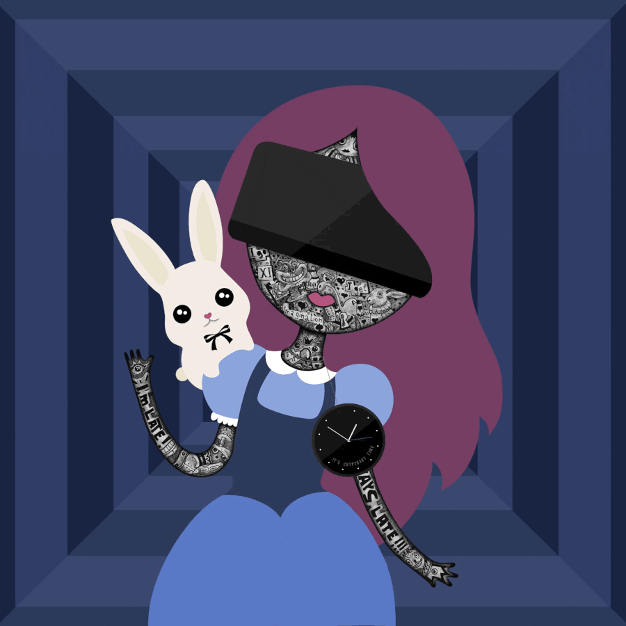 Hackatao’s Alice uses the VR oculus to satisfy her thirst and get into the land of many wonders. But the rabbit is not escaping anymore, he sits on her shoulder.