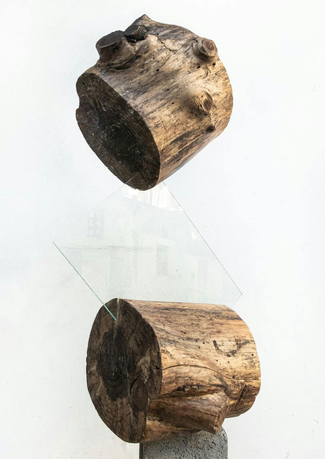 This is what I love about abstract installations: the artist completely distances themselves from what they are doing, exploiting the transcendent power of the gesture they make, leaving a trace of their work in the space. No theme, no ideal reference, no intellectual position. Only the emanation of a state of shaped creative energy. For years I have used large wooden logs in my installation work. I did what my grandfather did: I positioned the log, found a natural crack, inserted a 5/6 mm glass sheet into the crack, took another log and placed it on the glass sheet stuck in the first log using the crack in the second log.