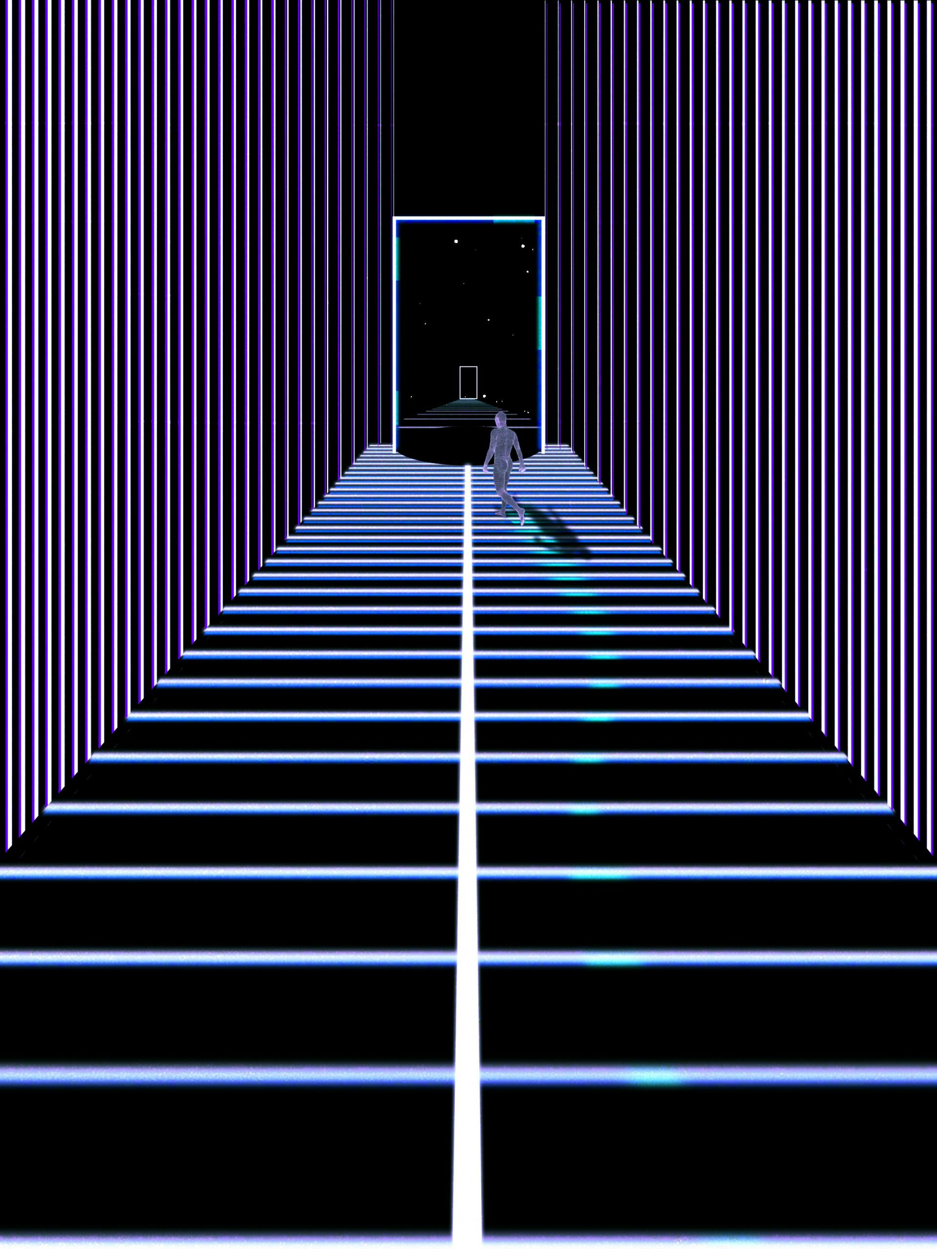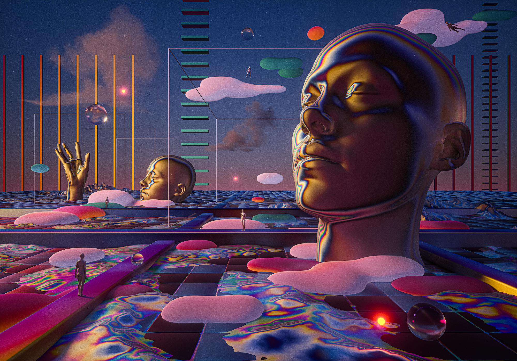 Compared to the same artist’s previous works tokenized on SuperRare, this piece has far more spacial depth with 1 point perspective. In this vast space, everything is a part of “Severe Surrealistic Hallucinations”. Colors become objects, minimalistic columns and rectangles are giant compared to the human figures walking across the “roads” leading to nowhere. There are bright light spots on the ground, in the sky, like super condensed celestial bodies. Huge human heads indicate perhaps ego and mental state. It’s a self traveling through his/her inner dimension, where all the abstract obtain concrete forms, and all the real becomes surreal. One cannot escape one’s own mind.