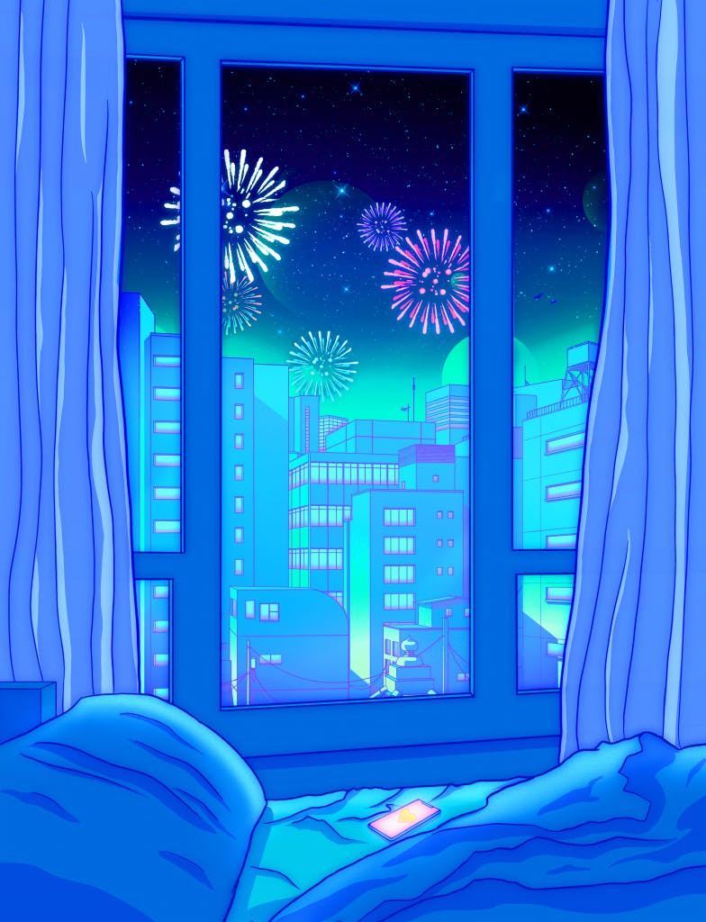 The work is amazing because you can feel a very strong sense of movements, dynamics, flickering of all the light, while it’s a perfectly static. I look at this still image and feel the power of a GIF. There’s light on the screen; fireworks light up all the buildings outside as well as the bedroom inside. It’s one instant whose very fleetness is forever captured. The immediate visual power brings you into the soothing night in Tokyo, you can almost hear the sound…