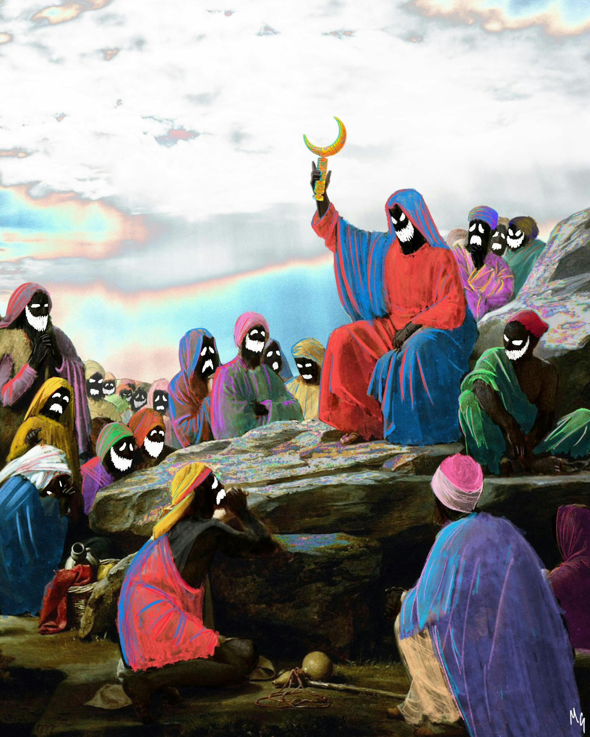 Now, how does this tie into my art? Let’s look at one of my recent pieces, “The Last Prayer”. I have taken the painting, “Sermon On The Mount” by Carl Bloch and drastically changed its message. In the focus of the piece, we see a fiend holding up a sort of symbol or idol. The surrounding crowd of fiends are all reacting in different ways. Some are excited, and some are horrified. Each fiend (or person) is unique in their own (genetic) way and reacts differently to the symbol being held high. What the symbol represents is arbitrary and up to the viewer.