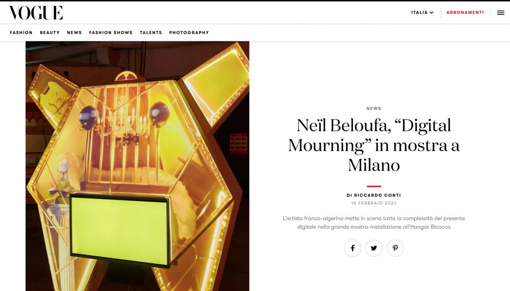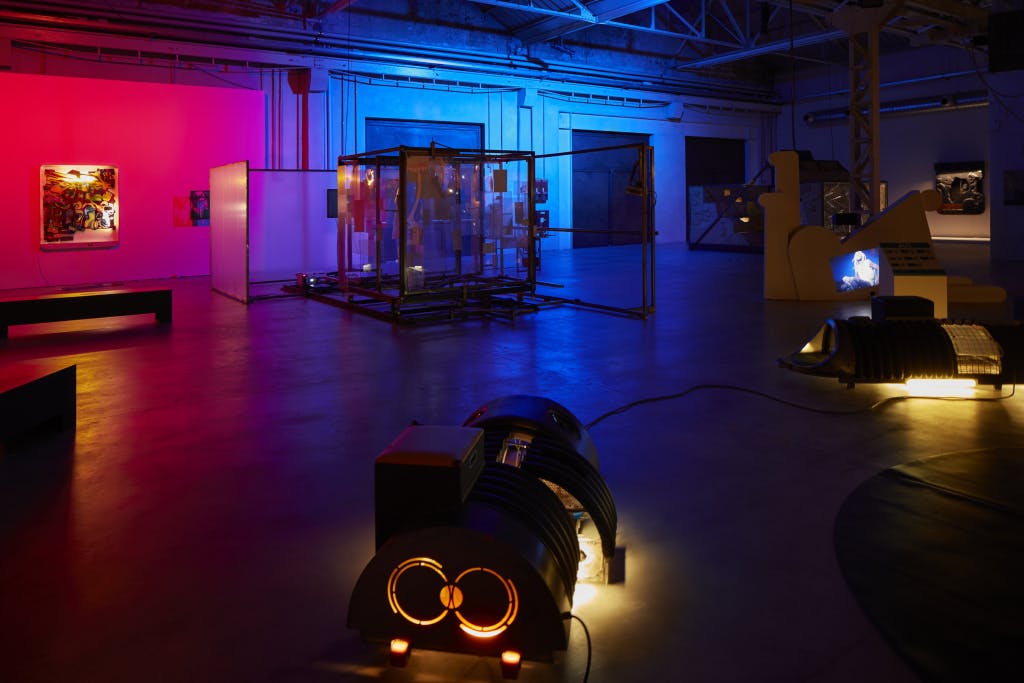 The exhibition “Digital Mourning” examines life in our digital world. It questions the divide between reality and simulation, addressing themes of power relationships and technological control. Much like the internet and social media feeds, where information is constantly evolving, the audience is faced with an encompassing experience where shifting narratives and changing images, sounds, colors, and lights, make it impossible to establish clear hierarchies.