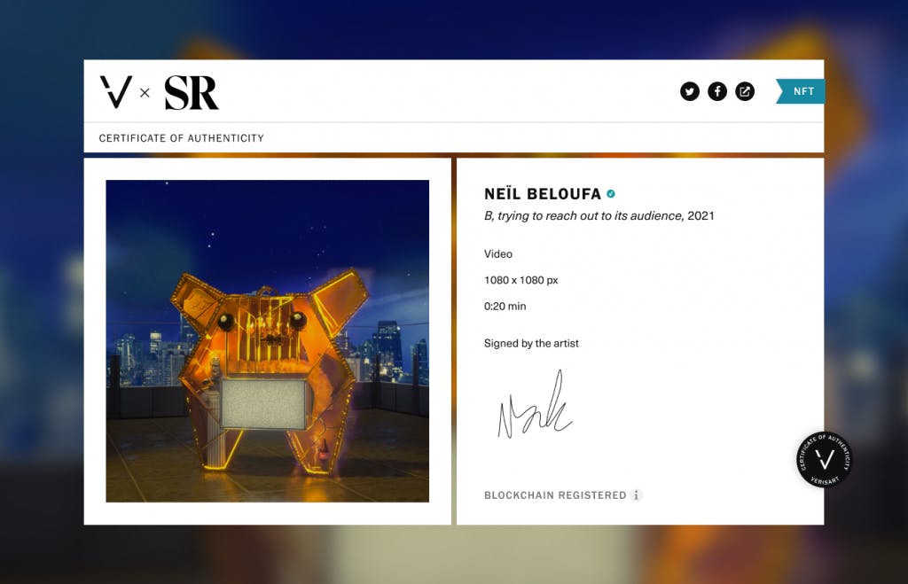 Neïl Beloufa’s inaugural NFT is certified by Verisart, an award-winning blockchain certification platform. Designed to empower artists to tell their own story of their work, the certificate includes additional images, videos and documents. For collectors, Verisart’s patent-pending Certificates of Authenticity (COA) form an integral part of collecting NFTs. They provide confidence in the identity of the artist and the verified history of the artwork.